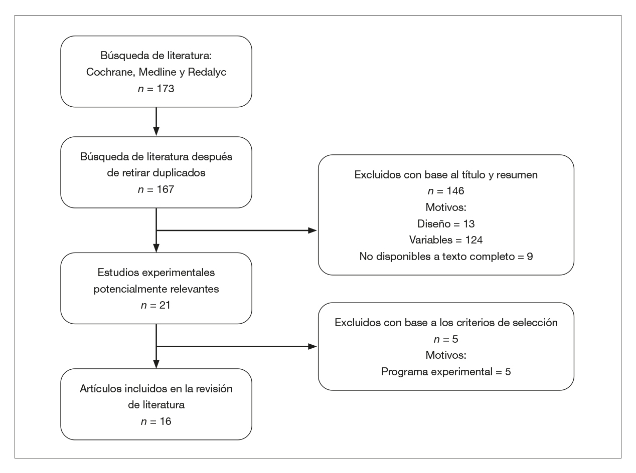 Se identificaron 173 artículos en las tres bases de datos. Se procedió a la revisión de los criterios de selección y finalmente se decidió procesar 16 artículos (Figura 1).