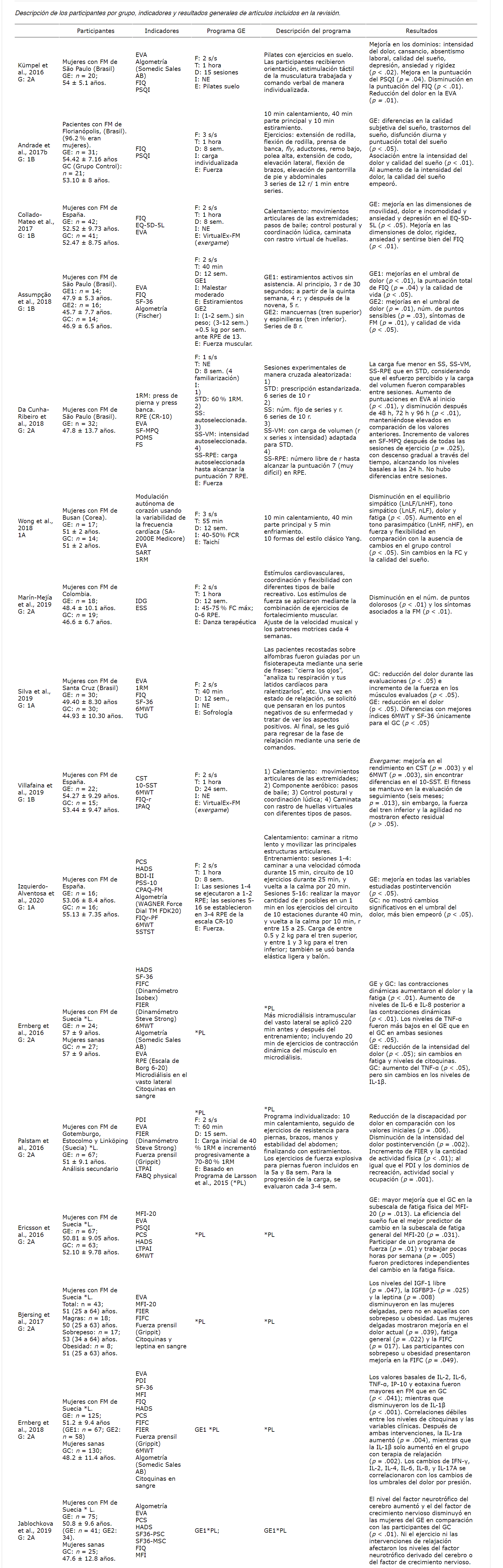 Nota. GE: Grupo experimental; GC: Grupo control; DE: Desviación estándar; NA: No aplica; NE: No especifica; FM: fibromialgia; F: Frecuencia; T: tiempo; D: Duración; I: Intensidad; E: Entrenamiento; RPE: Índice de Esfuerzo Percibido; FC: frecuencia cardíaca; FCR: frecuencia cardíaca de reserva; FCmáx: frecuencia cardíaca máxima; s/s: sesiones por semana; r: repeticiones; EVA: Escala Visual Analógica; FIQ: Fibromyalgia Impact Questionnaire; PSQI: Pittsburgh Sleep Quality Index; EQ-5D-5L: European Quality of life-5 Dimensions-5 Levels; 1RM: una repetición máxima; SF-MPQ: Short-Form McGill Pain Questionnaire; POMS: Profile of Mood States; FS: Feeling Scale; ESS: Escala de Severidad de Síntomas; IDG: Índice de Dolor Generalizado; SART: Sit-and-Reach Test; 6MWT: Six-minute Walk Test; TUG: Timed Up and Go; CST: Chair-stand Test; 10-SST: 10 Step Stair Test; FIQ-r: FIQ versión revisada; IPAQ: International Physical Activity Questionnaire; PCS: Pain Catastrophizing Scale; HADS: Hospital Anxiety and Depression Scale; BDI-II: Beck Depression Inventory-Second Edition; CPAQ-FM: Chronic Pain Acceptance Questionnaire; FIQr-PF: Subescala “Función Física” del FIQR; 5STST: Five-Repetition Sit-to-Stand Test; FIFC: Fuerza isométrica de flexión de codo; TNF-α: Factor de necrosis tumoral alfa; IL-6: Interleucina-6; IL-8: Interleucina-8; IL-1β: Interleucina-1 Beta; PDI: Pain Disability Index; FIER: Fuerza isométrica de extensión de rodilla; LTPAI: Leisure Time Physical Activity Instrument; FABQ physical: Fear Avoidance Beliefs Questionnaire physical subscale; MFI-20: Multidimensional Fatigue Inventory; IGFBP3: proteína 3 de unión al factor de crecimiento parecido a la insulina; IGF-1: Factor de Crecimiento Insulinoide; IP-10: Proteína inducible por IFN-γ 10; IFN-γ: Interferón gamma; IL-1ra: antagonista del receptor de la IL-1; SF-36: Short Form-36 Health Survey; SF36-PSC: SF-36 componente físico; SF-36 componente mental SF36-MSC; *L: Proyecto de Larsson et al., 2015; *PL: Protocolo experimental del proyecto de Larsson et al., 2015; *PLC: Protocolo de “Control activo” del proyecto de Larsson et al., 2015.