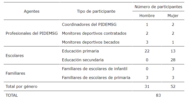 Para este estudio se realizaron entrevistas a 83 informantes clave, de las cuales 20 fueron efectuadas en el curso académico 2016-2017 y siete durante el curso escolar 2017-2018. Nueve entrevistas a escolares fueron grupales y las otras 18 fueron de carácter individual. Se entrevistó a tres coordinadores del Programa con más de tres años de experiencia en él; a cuatro monitores deportivos contratados con una experiencia en el Programa de tres o más años; a otros cuatro monitores becados con una experiencia en el Programa de entre uno y cinco años; a 35 escolares de primaria con edades comprendidas entre los 6 y los 12 años de niveles socioeconómicos bajo-medio y medio, y de colegios urbanos y rurales públicos; a 28 escolares de secundaria de edades comprendidas entre los 13 y 15 años de institutos públicos y concertados y con nivel socioeconómico medio-alto, a tres familiares de escolares de infantil y otros 6 de primaria (Tabla 1) con niveles socioeconómicos medios. La selección de estos participantes se realizó mediante un muestreo probabilístico no intencional por conveniencia y accesibilidad, tratando de escoger a aquellas personas que eran capaces de proporcionar información relevante y significativa en base a los siguientes criterios de inclusión y exclusión.