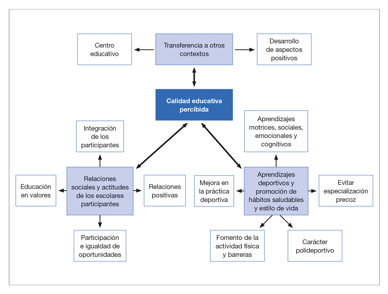 Los entrevistados expresaron que los aprendizajes deportivos, los aprendizajes cognitivos, las relaciones e interacciones sociales, o los valores que se adquirían en este Programa tenían transferencia a otros contextos, siendo el lugar de transferencia por excelencia la clase de EF, dado que “los contenidos que estamos desarrollando en el Programa están totalmente alineados y muy ligados en la manera de trabajar con el área de Educación Física” (ENIMO27, p. 6). Además, los entrevistados opinaron que lo adquirido en este Programa era en su mayoría positivo, como señaló un familiar: “entonces no sé si hay cosas negativas como puede ser un exceso de competición, puede haber discriminación en los chavales, pero por lo que yo veo no, y los que están participando todos juegan alegremente” (ENIFA18, p. 3). El contexto educativo resultó ser el principal lugar de transferencia de los conocimientos, aprendizajes y valores adquiridos en este programa, resultado que coincide con lo encontrado por Hemphill et al. (2019) y Lobo et al. (2020). En este sentido, Jacobs y Wright (2018) señalaron que para que se dé la transferencia es necesario un puente cognitivo que conecte los aprendizajes con su aplicación.