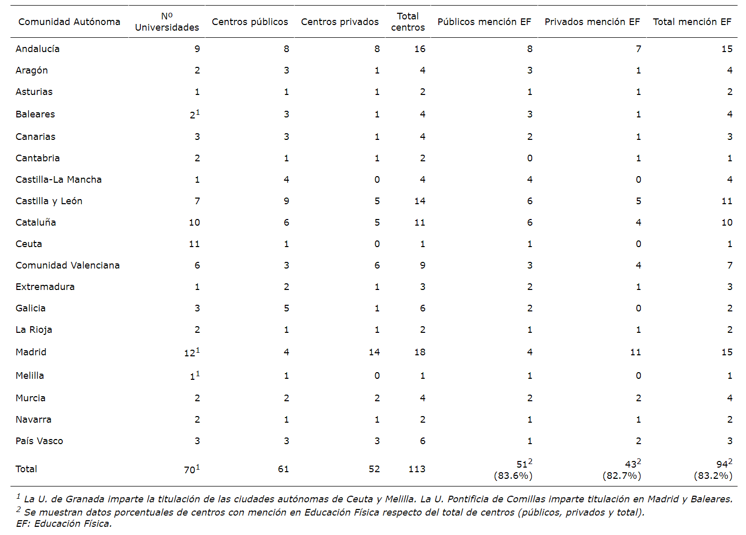 La mayoría de los centros ofertaron la mención en EF (Tabla 1), en un porcentaje que resulta similar entre los centros de titularidad pública y los centros privados. La oferta de esta mención estaba presente en todas las CCAA, ya fuera en centros públicos (menos Cantabria) o privados (menos Castilla-La Mancha, Galicia y las ciudades autónomas de Ceuta y Melilla). Las comunidades de Andalucía y Madrid cuentan con el mayor número de centros que impartían la titulación con mención en EF, repitiendo Madrid como la comunidad con mayor oferta privada, mientras que Andalucía presentaba la mayor oferta pública.