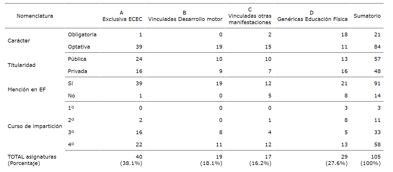 Para la selección de asignaturas se analizaron inicialmente las pertenecientes a la mención en EF; en caso de no localizar ninguna asignatura entre cuyos contenidos figurasen los propios de la EC, se analizaron todas aquellas del plan de estudios que hicieran referencia a: “EF”, “movimiento”, “corporal”, “expresión”, “ritmo” o términos análogos.