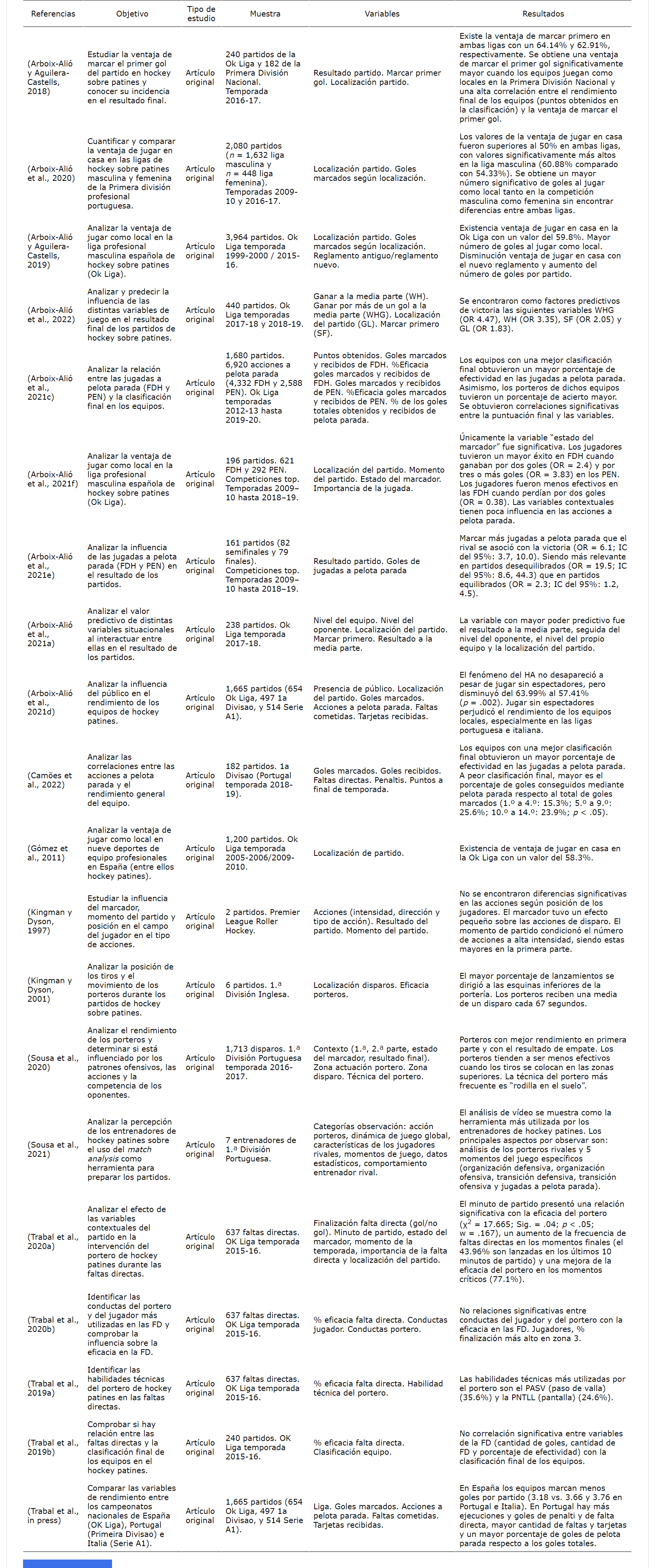 El principal objetivo de la presente investigación fue identificar las variables contextuales y de juego estudiadas por la literatura científica en el deporte de hockey sobre patines. La mayoría de las investigaciones realizadas hasta la fecha se han centrado en analizar la influencia del contexto, la relevancia de las jugadas a pelota parada y la influencia de la figura del portero en el resultado final. Cada tipo de análisis se discute a continuación.