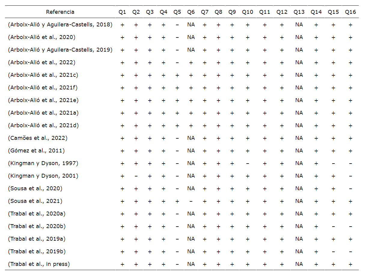 Se realizó una revisión sistemática de la literatura disponible sobre las variables de juego en el hockey patines siguiendo las pautas de la guía PRISMA (Preferred Reporting Items for Systematic reviews and Meta-analyses) de acuerdo con Moher et al. (2009). Además, la calidad de todos los estudios elegibles se evaluó utilizando una tabla siguiendo los criterios de Law et al. (1998). Dicha tabla está compuesta por 16 ítems que miden la calidad metodológica de los estudios (Tabla 1). La puntuación de cada ítem sigue una escala binaria (0/1) donde el 0 corresponde a una respuesta negativa y el 1 a una afirmativa. Del total de los 16 ítems, dos de ellos (6 y 13) no fueron aplicables a todos los estudios, por lo que se incluyó la opción NA (no aplicable). La suma del número total de ítems positivos se utilizó para indicar la calidad del estudio. Según su puntuación, los artículos se clasificaron en: a) baja calidad metodológica (< 50 %), b) buena calidad metodológica (51-75 %) y c) excelente calidad metodológica (> 75 %) (Sarmento et al., 2018).
