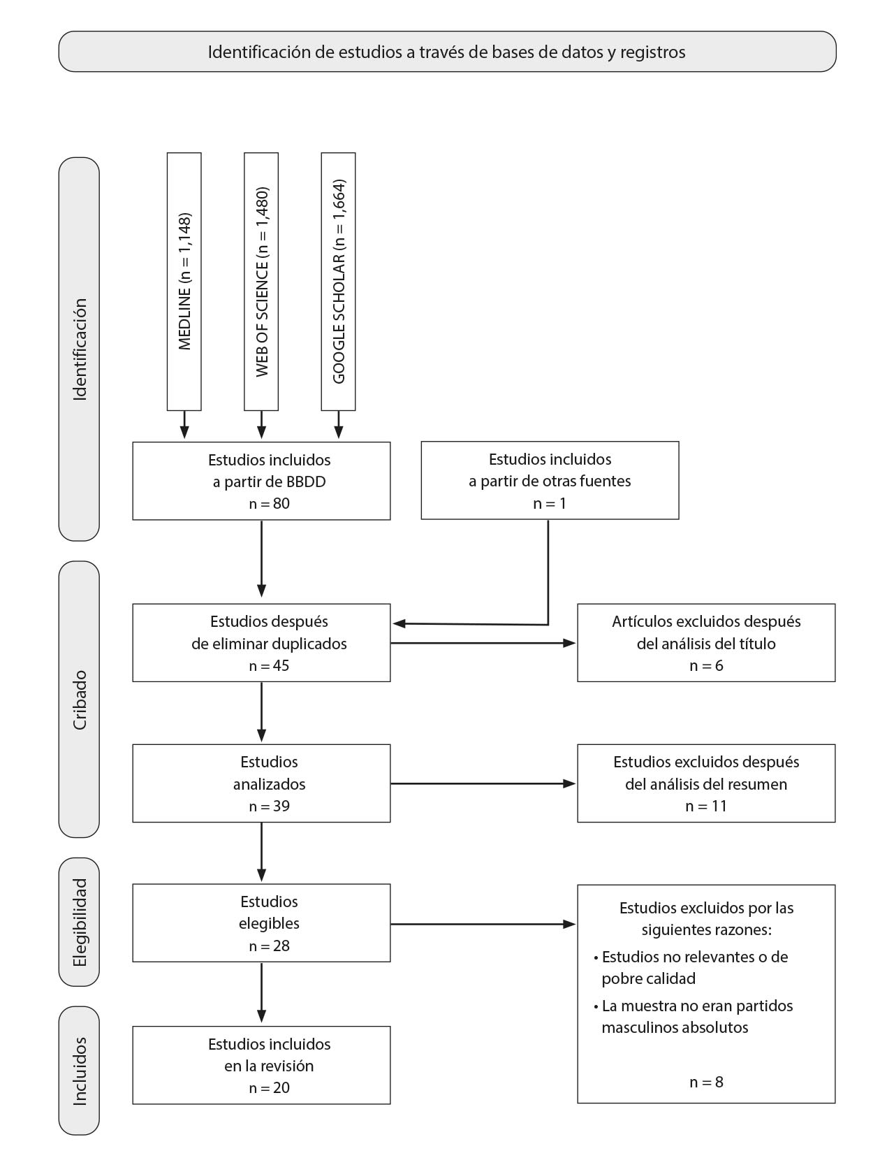 Los criterios de inclusión para estos artículos fueron: (1) datos relevantes sobre variables de partido en el deporte de hockey sobre patines; (2) datos referentes a competiciones profesionales y/o categorías sénior/absoluta y (3) escrito en idioma español o inglés. Los estudios se excluyeron si: (1) incluían categorías base o de formación (no sénior); (2) no incluyeron ningún dato relevante y (3) fueron resúmenes de congresos. Además, se excluyeron los artículos con discusión insuficiente, presentación de datos deficiente y descripciones poco claras o vagas de los protocolos aplicados (ver el diagrama de flujo de la búsqueda y selección de estudios en la Figura 1).
