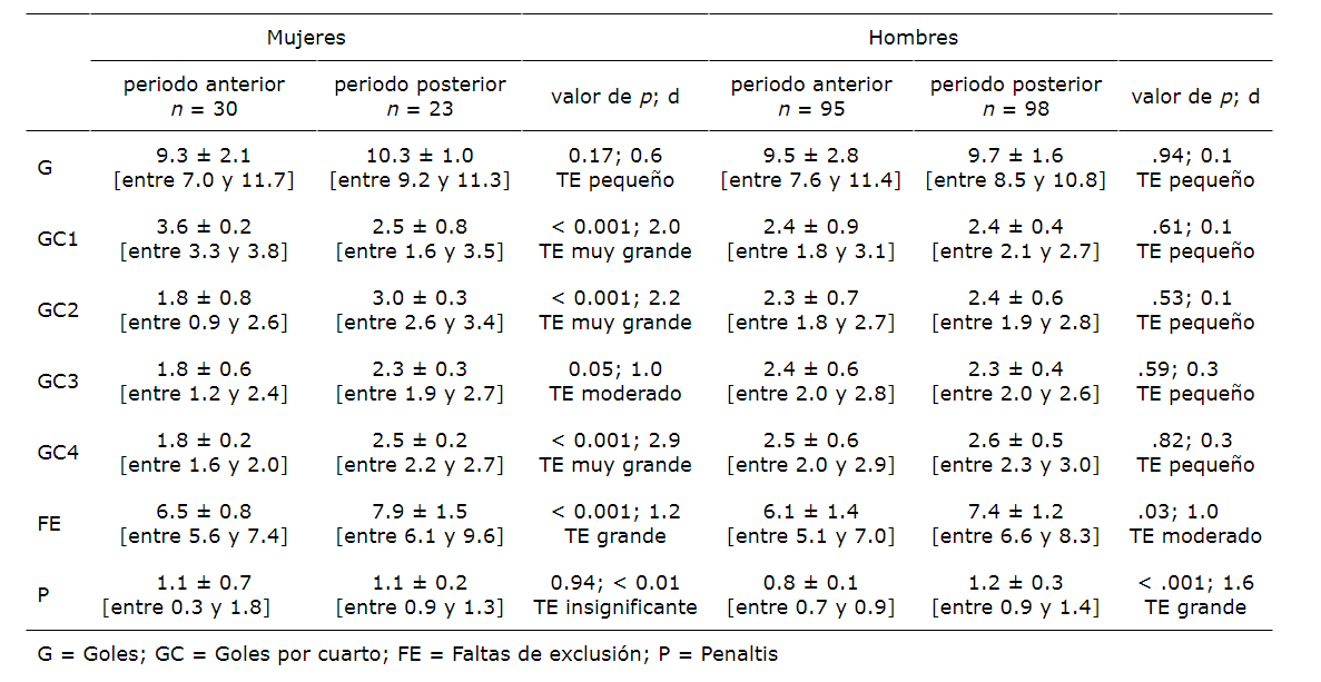 Media ± desviación típica, intervalos de confianza del 95 %, valor de p y tamaño del efecto (TE-d) correspondientes a los goles (G), los goles por cuarto (GC1-GC4), las faltas de exclusión (FE) y los penaltis (P) en campeonatos de élite femeninos y masculinos, antes y después de los cambios en las normas del waterpolo (n = número de partidos).
