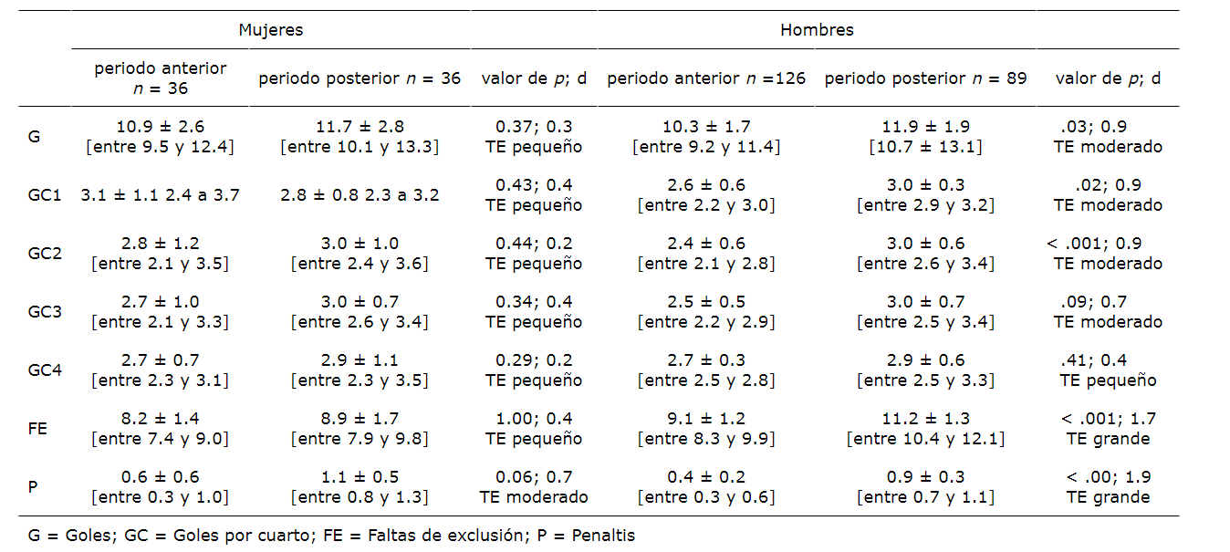 En el presente estudio, el aumento estadístico de los goles (tamaño del efecto moderado) se sumó al aumento de las faltas de exclusión y los penaltis (tamaño del efecto grande) y podría inducirnos a creer en la mejora del rendimiento de estas situaciones de juego. Sin embargo, Argudo et al. (2020b) constató un aumento en la frecuencia de disparos por partido en situaciones de desigualdad y penaltis, pero no en los goles en esta situación. Por otra parte, en los partidos equilibrados, los ganadores hacen un mayor número de ataques en situaciones de superioridad numérica que en los partidos desequilibrados (Escalante et al., 2012; Lupo et al., 2012b). La alta efectividad de las situaciones de superioridad numérica puede ser decisiva para definir el marcador del partido (Tucher et al., 2015).
