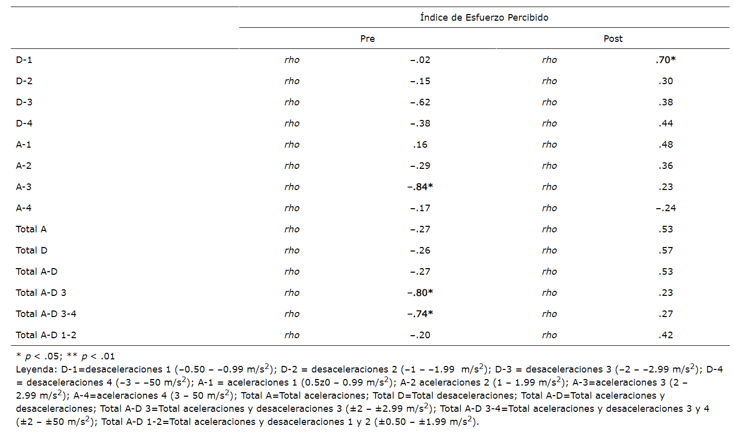 Por su lado, la CI se relacionó con la CE de los entrenamientos (. = 10). En las relaciones entre la CI y la CE, en el RPE-Pre se observaron relaciones en A-3 (rho = –.84; . < .01), Total A-D 3 (rho = –.80; . < .01), Total A-D 3-4 (rho = –.74; . = .02), y en el RPE-Post se observó una relación en D-1 (rho = .70; . = .03) (Tabla 4).