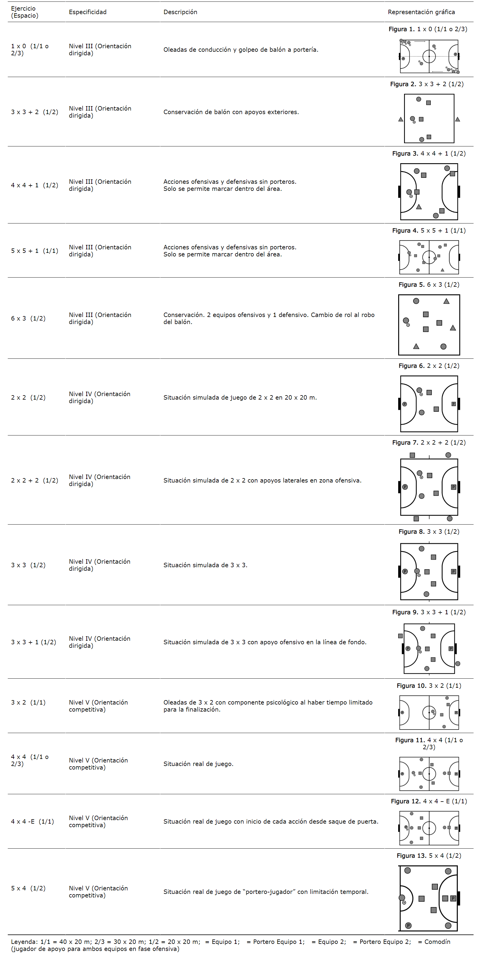 Durante los ejercicios en las sesiones de entrenamiento, las agrupaciones de compañeros y oponentes fueron variando de manera aleatoria. Estos ejercicios se han organizado según la adaptación de la clasificación de Moras (2000) y Vizuete (2017) en los siguientes niveles: los ejercicios de Nivel III (orientación especial) han sido un total de seis (1 x 0 1/1, 1 x 0 2/3, 3 x 3 + 2 1/2, 4 x 4 + 1 1/2, 5 x 5 + 1 1/1 y 6 x 3 1/2); cuatro de Nivel IV (orientación especial) (2 x 2 1/2, 2 x 2 + 2 1/2, 3 x 3 2/3 y 3 x 3 + 1 1/2); y cinco de Nivel V (orientación competitiva) (3 x 2 1/1, 4 x 4 1/1, 4 x 4 – E 1/1, 4 x 4 2/3 y 5 x 4 1/2) (Tabla 1).