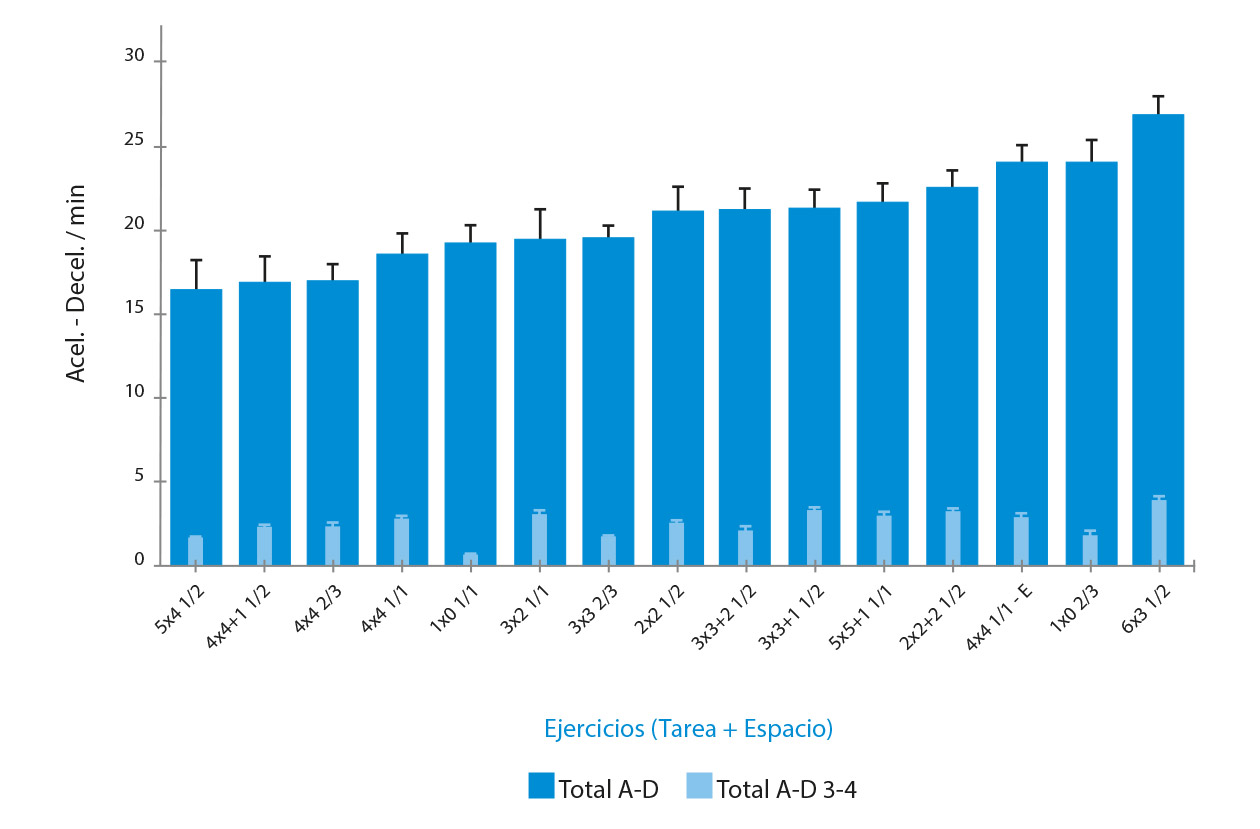 Durante las 10 sesiones registradas se obtuvieron un total de 382 observaciones. La CE, expresada como el promedio de las aceleraciones y desaceleraciones totales realizadas por jugador, fue de 1,004.52 ± 200 m/s.; y la CI, expresada como el promedio del RPE que presentaba cada jugador al finalizar el entrenamiento, fue de 7.58 ± 0.37. Atendiendo a la especificidad de los ejercicios, se realizaron seis ejercicios de Nivel III, registrándose en 135 ocasiones; cuatro ejercicios de Nivel IV, registrándose 81 veces; y cinco ejercicios de Nivel V, obteniendo un total de 166 registros. En el análisis descriptivo de CE, el valor más alto por jugador de Total A-D se dio en el 6 x 3 1/2 (26.86 ± 1.15 m/s.) y el más bajo en el 5 x 4 1/2 (16.44 ± 1.81 m/s.). Para Total A-D 3-4, el valor más alto se mostró en el 6 x 3 1/2 (3.85 ± 0.30 m/s.) y el más bajo en el 1 x 0 1/1 (0.61 ± 0.13 m/s.) (Figura 14). Finalmente, el valor más alto en Total A-D 1-2 se dio en el 6 x 3 1/2 (23.02 ± 0.86 m/s.) y el más bajo en el 4 x 4 + 1 1/2 (14.57 ± 1.43 m/s.) (Tabla 2).