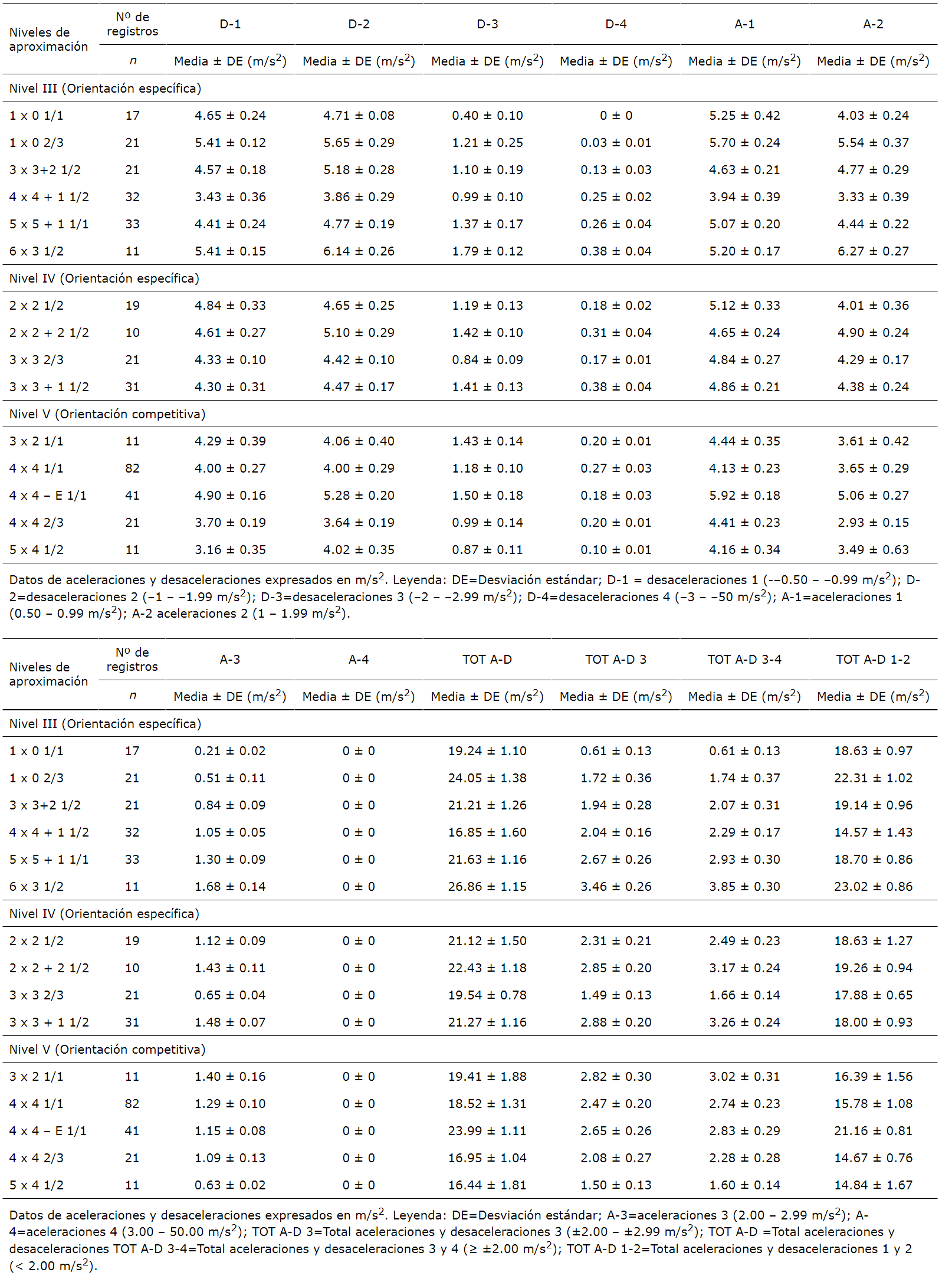 La CE se midió a través de las aceleraciones y desaceleraciones de los jugadores a partir de los dispositivos Polar Team Pro®, que tienen integrado un sensor de movimiento MEMS (acelerómetro, giroscopio y brújula digital) y un GPS de 10 Hz, y los cuales han presentado validez y fiabilidad en la medida de la CE en deportes de equipo (Fox et al., 2019). A cada jugador se le asignó el mismo sensor (Polar Team Pro Sensor®) durante todo el periodo de recogida de datos, y este estaba localizado en el pecho a partir de las bandas elásticas de la propia marca (Sánchez-Ballesta et al., 2019). La información recogida se enviaba a través de bluetooth a un dispositivo móvil (iPad) y se almacenaba en la aplicación de la propia marca para analizarse posteriormente con el software del Polar Team Pro® (https://teampro.polar.com; Kempele, Finlandia). Con estos sensores se registraron cuatro niveles de aceleraciones (A-1 englobaron las aceleraciones de 0.50 m/s. a 0.99 m/s.; A-2 las de 1 m/s. a 1.99 m/s.; A-3 las de 2 m/s. a 2.99 m/s., y A-4 las de 3 m/s. a 50 m/s.) y cuatro de desaceleraciones (D-1 incluyeron las de –0.50 m/s. a –0.99 m/s.; D-2 las de –1 m/s. a –1.99 m/s.; D-3 las de –2 m/s. a –2.99m/s., y D-4 las de –3m/s. a –50m/s.). Esta CE se clasificó según su intensidad, teniendo el nivel uno y dos (1-2) como baja intensidad, y el nivel tres y cuatro (3-4) como alta intensidad. A partir de estos niveles, se agruparon los valores de la siguiente manera: total de aceleraciones (Total A, sumatorio de A-1, A-2, A-3 y A-4); total de desaceleraciones (Total D, sumatorio de D-1, D-2, D-3 y D-4); total aceleraciones y desaceleraciones (Total A-D, sumatorio de Total A y Total D); total aceleraciones y desaceleraciones nivel tres (Total A-D 3, sumatorio de A-3 y D-3); total aceleraciones y desaceleraciones nivel tres y cuatro (Total A-D 3-4, sumatorio de A-3, A-4, D-3 y D-4), y total aceleraciones y desaceleraciones nivel uno y dos (Total A-D 1-2, sumatorio de A-1, A-2, D-1 y D-2) (Sánchez-Ballesta et al., 2019).