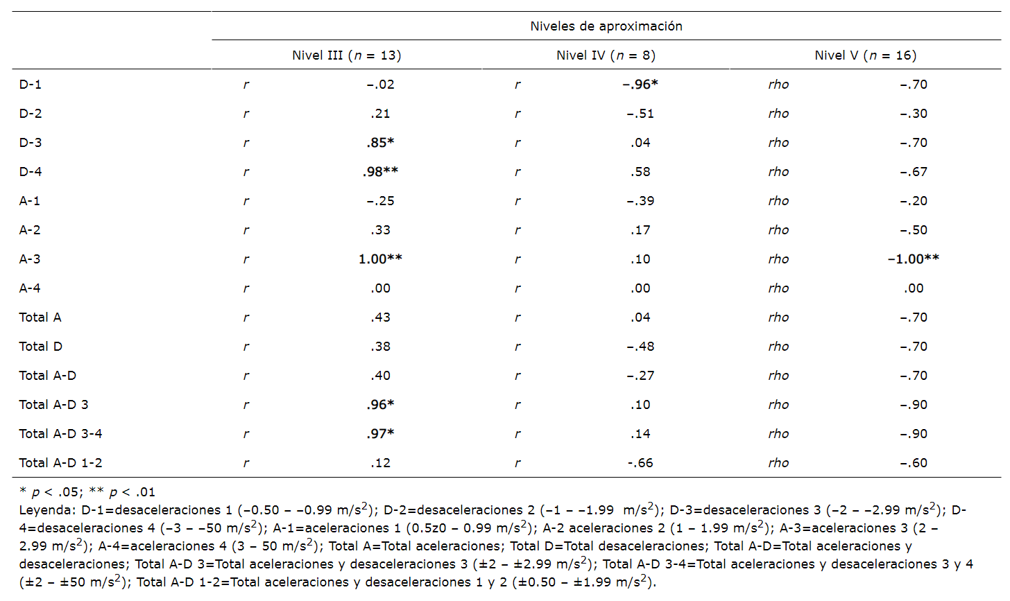El carácter multifactorial y complejo de los procesos adaptativos de los y las deportistas provoca la necesidad de realizar entrenamientos con niveles de aproximación variables (Vizuete, 2017), los cuales pueden ser una herramienta útil para la programación de la carga de trabajo (Colby et al., 2014). En este contexto, se ha observado que las relaciones se han dado principalmente desde una perspectiva cualitativa (alta intensidad), mostrando relaciones significativas (. < .05) entre la CE de carácter cualitativo (aceleraciones y desaceleraciones de alta intensidad) y los ejercicios de Nivel III y Nivel V (Sánchez-Ballesta et al., 2019). Atendiendo a los resultados obtenidos en los ejercicios de Nivel III, y teniendo en cuenta las características de la muestra, en la presente investigación se ha podido demostrar la causalidad (R. > .70) de estos datos a través de la regresión lineal. Estos resultados sugieren que sería posible la programación de los ejercicios en las sesiones de entrenamiento hacia un carácter cualitativo (alta intensidad) a través de la aplicación de los niveles de aproximación.