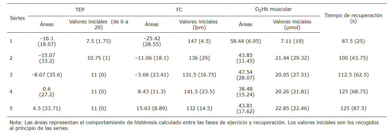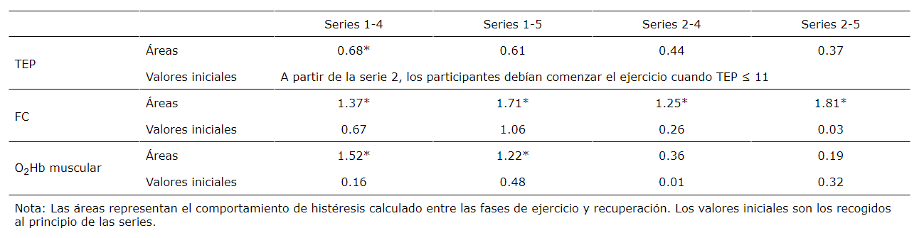 La Tabla 1 muestra los valores de las áreas de histéresis y los valores iniciales de TEP, FC y O.Hb muscular para cada serie de ejercicio. Además, ilustra el modo en que el tiempo de recuperación en reposo entre series aumentó con la acumulación del esfuerzo. La Tabla 2 muestra los tamaños del efecto y las diferencias significativas en las áreas de histéresis y los valores iniciales de TEP, FC y O.Hb muscular entre las series iniciales y finales.