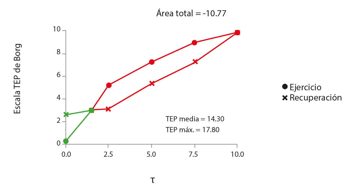 Las áreas de histéresis de las variables psicobiológicas estudiadas se calcularon según Montull et al. (2020). Se tuvo en cuenta el espacio entre las fases de ejercicio y recuperación para cada variable y serie. Dado que la carga de trabajo era constante en todas las series de ejercicio y nula durante la recuperación, el parámetro de control seleccionado fue la duración del esfuerzo-recuperación (τ). Correspondía al tiempo actual de ejercicio o recuperación dividido entre el tiempo total de ejercicio (100 s). Las variables estudiadas y la τ se normalizaron de 0 a 10 para relativizarlas en la misma escala antes de calcular las áreas. Calculamos el área de histéresis total como la suma de las áreas parciales positivas y negativas. Las áreas se consideraron positivas cuando los valores de la fase de recuperación eran superiores a los de la fase de ejercicio, mientras que se consideraron negativas cuando los valores de la fase de recuperación eran inferiores a los de la fase de ejercicio (véase la Figura 2 a modo de ejemplo). En caso de que la fase de recuperación fuera más larga que la de ejercicio, aplicamos la misma lógica: hasta que los valores de recuperación no fueran inferiores al valor inicial de ejercicio, el área no se consideró negativa. Para este cálculo, se utilizó Matlab R2020a.