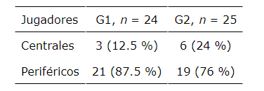 En la Tabla 3 se muestran las medidas de centralidad para el G1 y el G2 en relación con la posición táctica, la experiencia, la edad, la altura, la envergadura, la masa corporal total, SV, AGIL y VL.