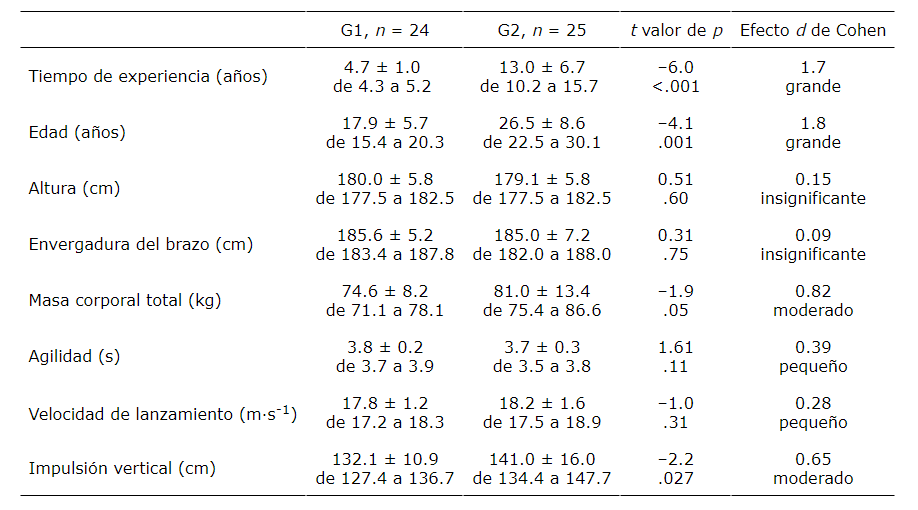 En la Tabla 2 se muestran las descripciones y comparaciones del tiempo de experiencia, la edad, las características antropométricas y los parámetros de rendimiento, así como los tamaños del efecto de la experiencia. El tiempo de experiencia presentó: (i) un gran tamaño del efecto sobre la edad, (ii) insignificante sobre la altura y la envergadura, y (iii) moderado sobre la masa corporal. En cuanto a los parámetros de rendimiento, los efectos de los grupos de experiencia fueron: (i) moderados en el salto vertical y (ii) pequeños en la agilidad con el balón y la velocidad de lanzamiento. Los G2 tenían más edad, más experiencia y más peso, y alcanzaban valores de SV superiores al G1.