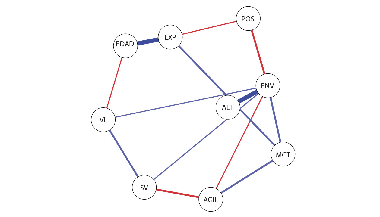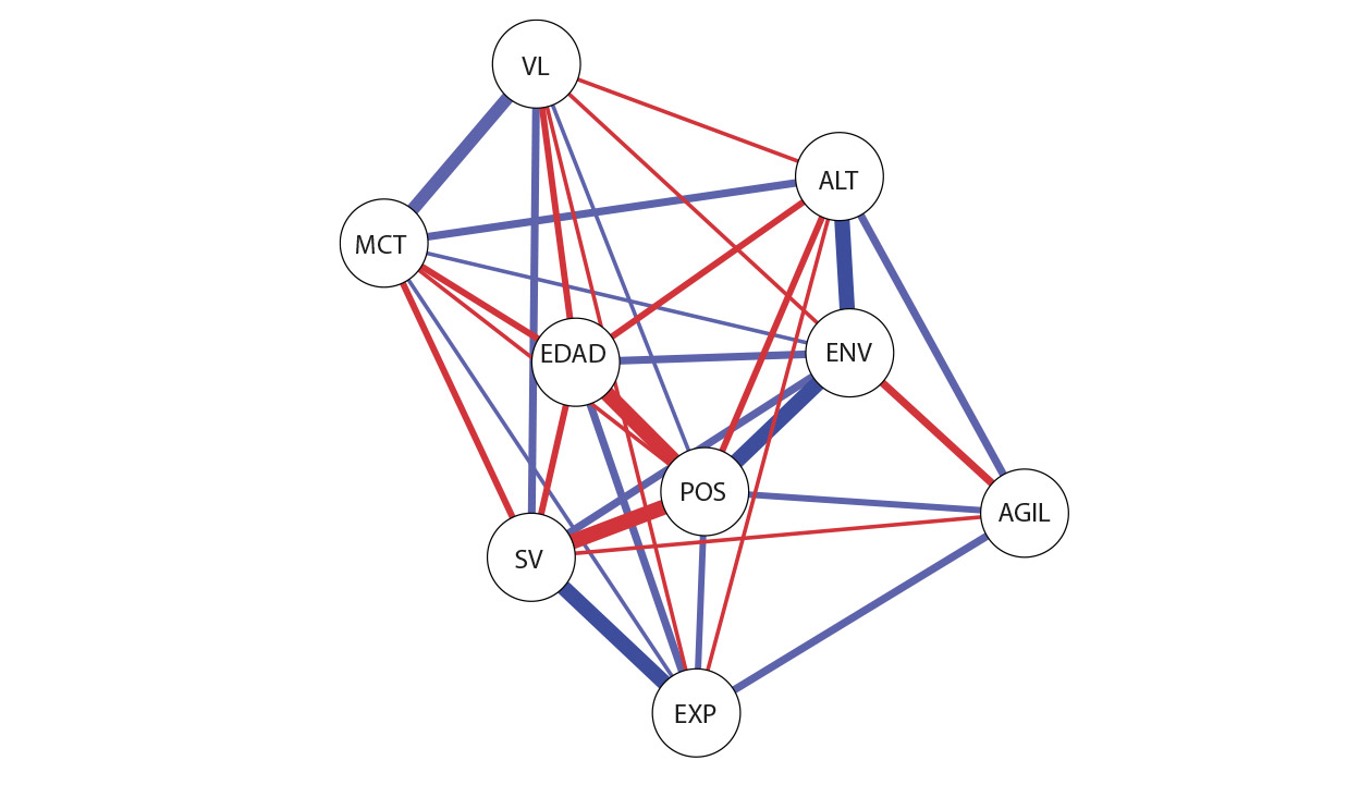 Por lo que respecta a las medidas de centralidad, cuanto más se alejen de cero, mayor es la relevancia de la variable dentro del sistema. En este estudio, se utilizó el modelo de campo aleatorio «pairwise Markov» para aumentar la precisión de la red de correlación parcial. El algoritmo de estimación utilizado asume la interacción de mayor orden del grafo verdadero. El algoritmo incluye una penalización L1 (regresión por vecindad ponderada). La ponderación se consigue mediante un operador de selección y contracción mínima absoluta (LASSO, por sus siglas en inglés) que controla la dispersión del modelo (Friedman et al., 2008). Se utilizó el criterio de información bayesiano ampliado (EBIC, por sus siglas en inglés) porque es más conservador seleccionar λ a partir del parámetro de ponderación. El EBIC utiliza un hiperparámetro (y) que determina en qué medida selecciona modelos dispersos (Chen, 2008; Foygel y Drton, 2011). El valor de y suele fijarse entre 0 y 0.5. Los valores más altos indican modelos más parsimoniosos con menos aristas. Un valor cercano a 0 indica una estimación con más aristas. Un valor de y de 0.25 es potencialmente útil para las redes exploratorias. Se utilizó este valor en el presente estudio (Foygel y Drton, 2011). El LASSO ponderó los algoritmos para obtener la matriz de precisión, que, una vez normalizada, representa las asociaciones entre las variables de la red. Las relaciones positivas de la red se muestran en verde y las negativas, en rojo. El grosor y la intensidad de los colores representan la magnitud de las asociaciones. Para el análisis y la construcción de las redes, se utilizaron los programas SPSS v.20.0 y versión 0.14.1.0.