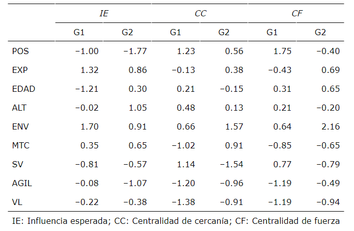Los valores de IE, relativos a los parámetros de rendimiento, indican que, para el G1, AGIL (-0.08) es la variable de más difícil acceso y con menor capacidad de ser objeto de intervenciones directas. En el G1, fue posible identificar la importancia de la experiencia para todas las variables de la red (1.32). En cuanto a los parámetros antropométricos, para el G2 las principales variables fueron la envergadura del brazo (1.05) y la altura (0.91). Para el G1, la variable indicada más destacada fue la envergadura del brazo (1.70). En cuanto a la CC, teniendo en cuenta los parámetros de rendimiento, los valores indican que, para el G1, el SV (1.14) es la variable más próxima a la otra en la red. En consecuencia, una intervención podría surtir efecto sobre el SV rápidamente. En cuanto a la posición táctica, el G1 y el G2 presentaron, respectivamente, 1.23 y 0.56. Los valores sugieren que, en el caso del G1, la posición táctica es más sensible a los cambios. Este resultado puede indicar la baja especialidad de la acción en relación con el papel que deben desempeñar los jugadores menos experimentados. En cuanto a los parámetros antropométricos, destaca el valor presentado para la envergadura del brazo (1.57) y la masa corporal (0.91) en el G2. Los valores de CF, en los parámetros de rendimiento, indican que, para el G1, SV (0.77) tiene relaciones más fuertes en el estándar de red actual. En relación con la posición táctica, el G1 y el G2 presentaron, respectivamente, 1.75 y -0.40. En cuanto a la experiencia, también hubo diferencias entre los grupos. El G1 y el G2 presentaron, respectivamente, -0.43 y 0.69. En cuanto a los parámetros antropométricos, destaca el valor presentado para la envergadura (2.16) en el G2. Este resultado indica la magnitud de las relaciones entre la envergadura y las demás variables. Así pues, los parámetros antropométricos pueden considerarse esenciales para que los entrenadores determinen las posiciones tácticas de sus deportistas en sus equipos.