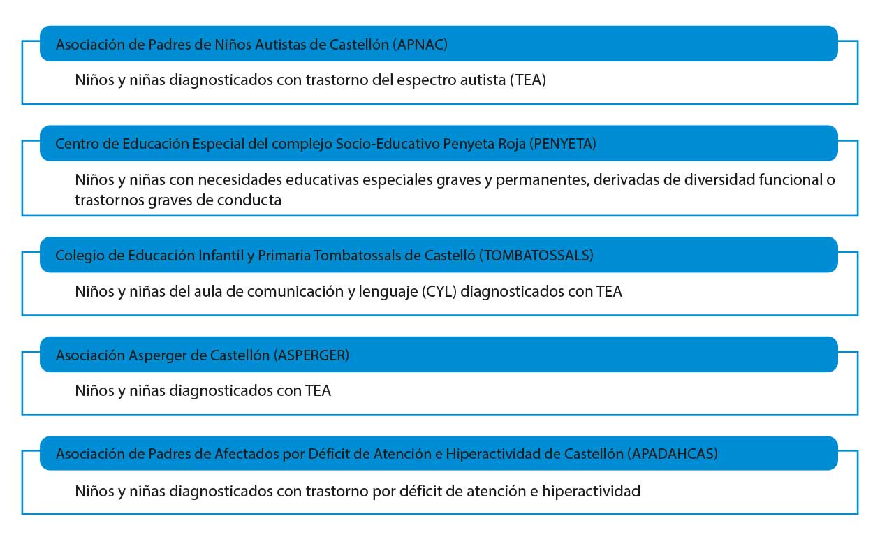El programa de ApS se desarrolló en colaboración con entidades del entramado socioeducativo de la ciudad de Castellón de la Plana (Figura 1) que atienden a colectivos de niños y niñas con diferentes trastornos, todos con afectaciones motrices, sociales y comunicativas.