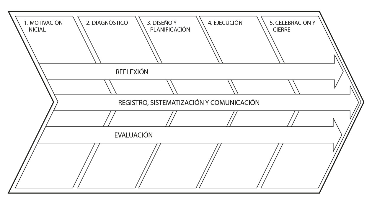 Se organizó al alumnado en grupos de trabajo de entre cuatro y seis integrantes para llevar a cabo el diseño y la implementación de sesiones de juegos y actividades de expresión corporal dirigidas a mejorar el área motriz y de socialización de los niños y niñas participantes. Para que un proyecto de ApS se desarrolle adecuadamente es importante seguir unas fases predeterminadas. Cada grupo desarrolló un proyecto en una entidad de referencia siguiendo el modelo (Figura 2) propuesto por el CLAYSS (2016). Dentro del sistema de evaluación de la asignatura, el proyecto de ApS se refleja en el apartado de elaboración y/o exposición de trabajos, con un valor del 30% sobre el total de la nota.