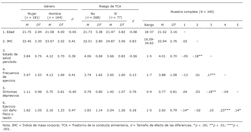 Se adoptó una aproximación analítica similar a la empleada en el estudio cuyos resultados se pretendieron replicar (Alcaraz‐Ibáñez et al., 2022a), considerando en este caso la práctica de ejercicio físico en presencia de problemas físicos o en situaciones de lesión en lugar de los síntomas de las adicciones conductuales adaptados al contexto del ejercicio. Se obtuvieron en primer lugar los estadísticos descriptivos y las correlaciones (.) entre las variables de estudio. Seguidamente, se calcularon las diferencias (.) en función del género y el nivel de riesgo de TCA, para las distintas variables de estudio, las cuales fueron interpretadas como triviales (.00 a .20), pequeñas (.20 a .50), moderadas (.50 a .80), o grandes (> .80) (Cohen, 1988).