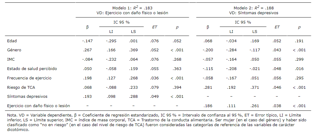 Se obtuvieron los siguientes índices de ajuste para el modelo de medida: χ. = 58.238, gl = 19, χ./gl = 3.065, . < .001; CFI = .994; RMSEA = .077 [IC 90 % = .055 a .100], . = .023; WRMR = 0.773. Los resultados de los dos modelos de regresión especificados se presentan en la Tabla 2. Los resultados del primero de dichos modelos mostraron que ser hombre (β = .267; IC 95 % = .166 a .369; . < .001), la frecuencia de práctica de ejercicio (β = .198; IC 95 % = .127 a .268; . < .001) y la presencia de sintomatología depresiva (β = .193; IC 95 % = .098 a .288; . < .001) explicaban positivamente una proporción significativa de varianza de la realización de ejercicio en presencia de daño físico o lesión, siendo esta del 18.30 %. Los resultados del segundo de los modelos testados indicaron que ser hombre (β = -.200; IC 95 % = -.284 a -.117; . < .001) y el estado de salud percibido (β = -.115; 95 % IC 95 % = -.208 a -.021; . = .016) explicaban negativamente una proporción significativa de varianza de la sintomatología depresiva, mientras que estar en situación de riesgo de sufrir un TCA (β = .281; IC 95 % = .192 a .371; . < .001) y la realización de ejercicio en presencia de daño físico o lesión (β = .186; IIC 95 % = .111 a .261; . < .001) contribuían positivamente a explicar una proporción significativa de varianza de dicha variable dependiente. En concreto, la varianza explicada en este segundo modelo fue del 18.80 %.
