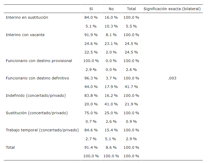 En cuanto a la situación laboral, la tabla 4 nos muestra en general una amplia diferencia entre los docentes que realizan AFMN dentro de la etapa de secundaria, con respecto a los que no las realizan. Destaca el funcionario con destino provisional, en el que el 100 % de las respuestas indican incluir las AFMN dentro de su programación de aula. Al mismo tiempo, si atendemos al porcentaje de docentes que incluyen las AFMN como parte de sus sesiones, la diferencia amplia la encontramos en los funcionarios con destino definitivo, con un 44 %; en el extremo opuesto encontramos a los sustitutos en centros concertados/privados, con un 0.7 % de docentes que incluyen estas actividades en sus sesiones. La prueba de Fisher nos arrojó resultados significativos respecto a la relación entre situación laboral y programación de AFMN, con una significación del .003, siendo que aquellos docentes con plazas fijas o estables son los que más programan estas actividades y va descendiendo a medida que la situación laboral se convierte en más inestable.