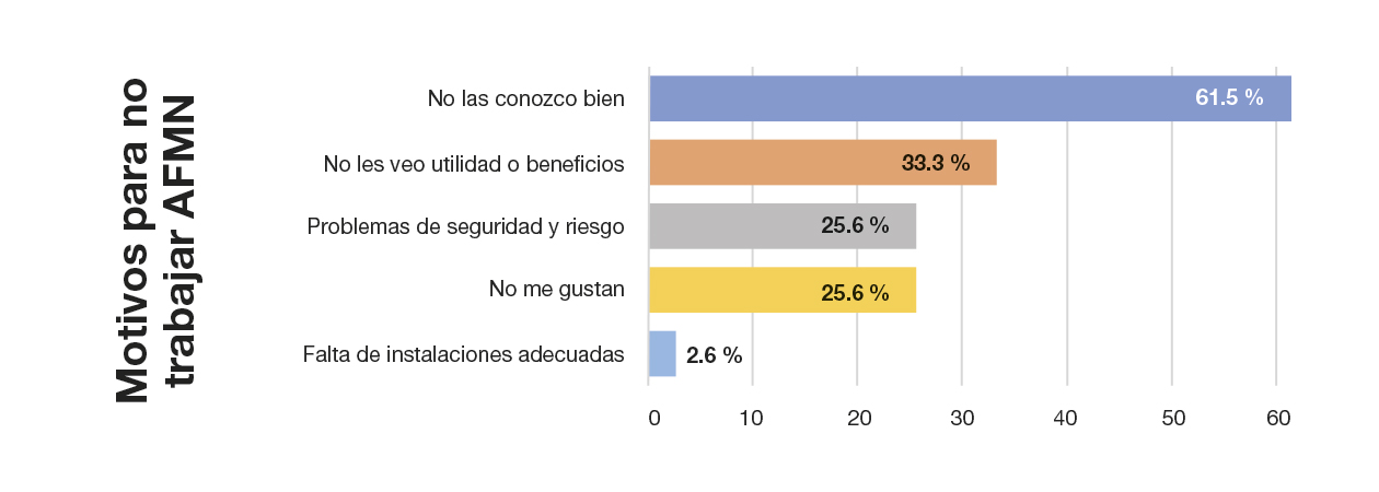 Como se puede observar, la principal razón en la exclusión de las AFMN es la falta de conocimiento y/o formación sobre estas para llevarlas a cabo (61.5 %). Aunque es reseñable la respuesta “No les veo utilidad o beneficios”, con un 33.3 %, así como “No me gustan”, con el 25.6 %.