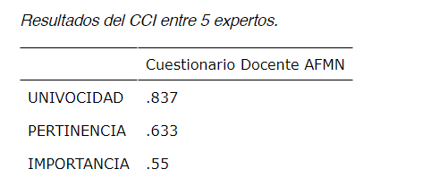 Este cuestionario fue validado previamente a través de consulta a cinco expertos, doctores y licenciados en Ciencias de la Educación Física, con amplio recorrido en las AFMN, y expertos en diseño y validación de cuestionarios educativos. Junto al cuestionario, se les facilitó una hoja de respuestas en la que pudiesen señalar en una escala de 1-4 la univocidad, pertinencia, importancia y las observaciones oportunas. Con las respuestas de todos los expertos se llevó a cabo un análisis estadístico a través del Programa SPSS v.26. Con este fin se calculó el Coeficiente de Correlación Intraclase (CCI), calculando la coincidencia de los expertos en cuanto a univocidad, pertinencia e importancia en cada ítem. Los valores obtenidos se presentan en la Tabla 1.