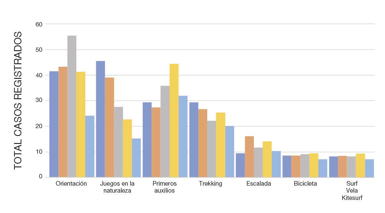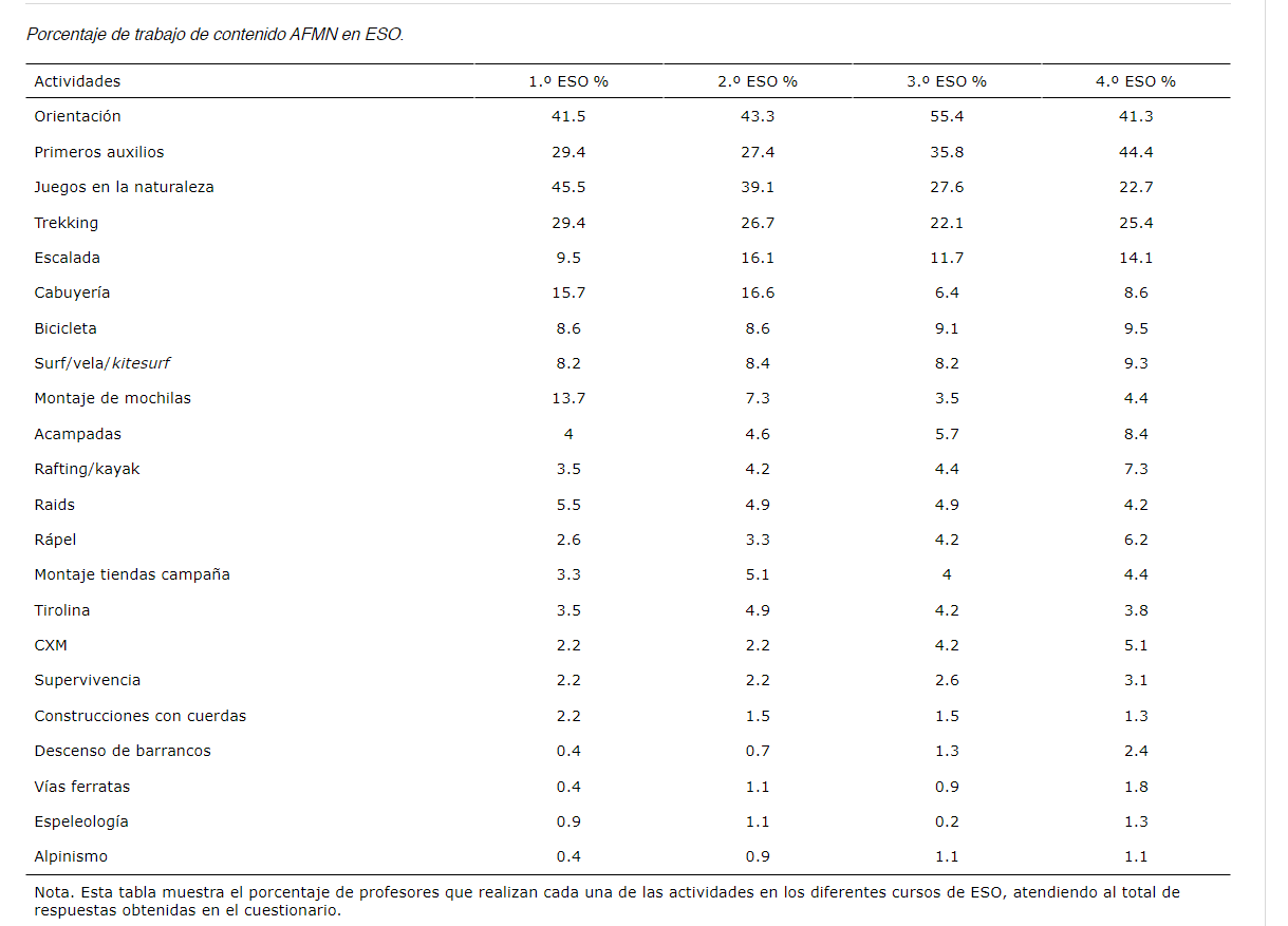 Adicionalmente, se ha mostrado un claro interés por conocer el tipo de actividades que se llevan a cabo en los centros educativos en relación con las AFMN. En este aspecto, la literatura muestra que los contenidos principalmente trabajados son la orientación, el senderismo y los juegos en la naturaleza (Granero-Gallegos et al., 2010; Peñarrubia Lozano et al., 2011; Torres et al., 2016). Como justificación a no incluir otras actividades como pueden ser la escalada o espeleología, entre otras, los docentes alegan, junto a los inconvenientes nombrados con anterioridad, la complejidad de poder compaginar la modificación del horario escolar con las salidas al medio natural o la falta de material específico para la realización de otras actividades (Hurtado-Barroso et al., 2019).