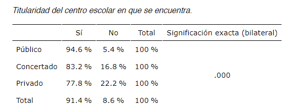 En la tabla 3 comprobamos que, sea cual sea la titularidad del centro escolar, el porcentaje de los docentes que llevan a cabo AFMN dentro de su programación de aula es muy superior al de los docentes que no integran estas actividades dentro de la programación.