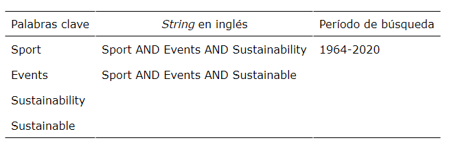 La configuración del string se realizó con la combinación de las siguientes palabras: “deporte”, “eventos”, “sostenibilidad” y “sostenible” (Tabla 1).