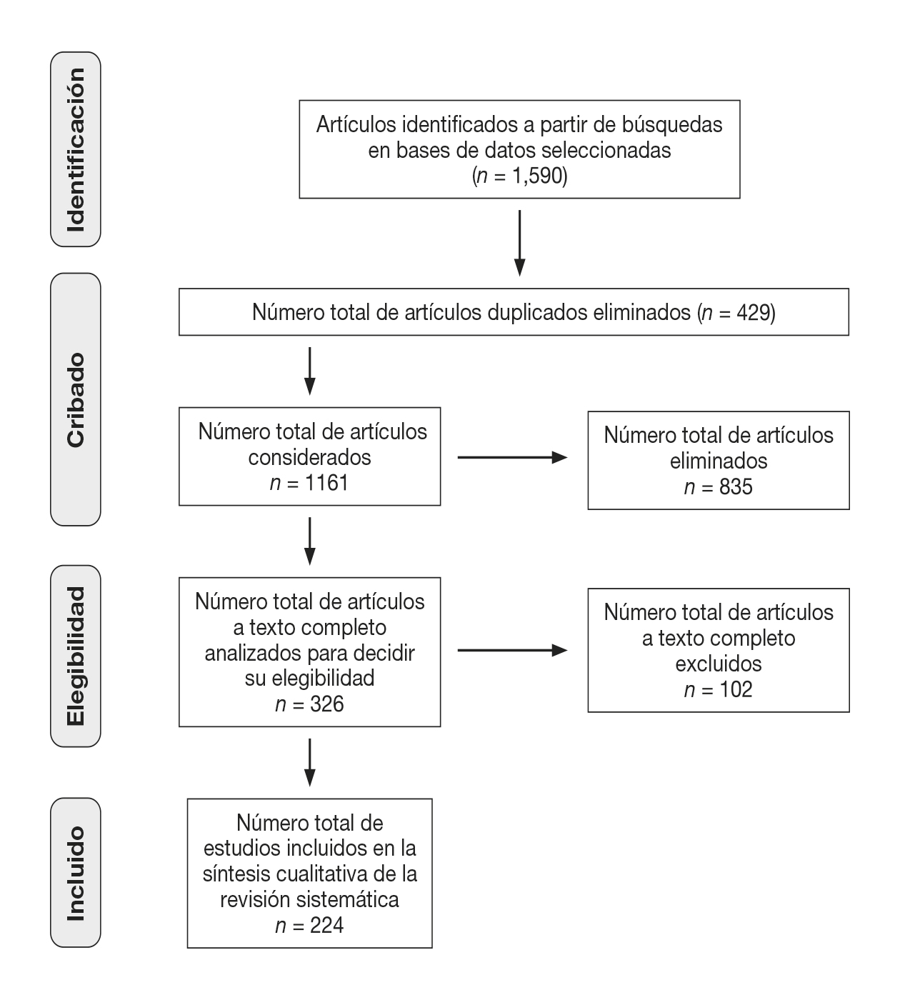 La recopilación inicial de artículos fue de 1,590 registros. Después de descartar los duplicados (. = 429), se realizó el cribado por título y resumen (. = 835) mediante el programa Abstrackr (revisión por pares). Una vez seleccionados los artículos, se procedió a su lectura (. = 326) y se excluyeron un total de 102 artículos. Las razones de exclusión de los artículos se basaron en la consideración de los siguientes aspectos: i) respecto a la dimensión evento, no especificación del evento al que aludía —se referían a eventos deportivos en general—, o no incluir, dentro del mismo, eventos estrictamente deportivos; y ii) respecto a la dimensión de sostenibilidad, no inclusión del estudio de la sostenibilidad como tal. En la Figura se puede consultar la base de datos finalmente considerada, que en este caso quedó conformada, después de la aplicación de las diferentes fases de cribado, por un total de 224 artículos.