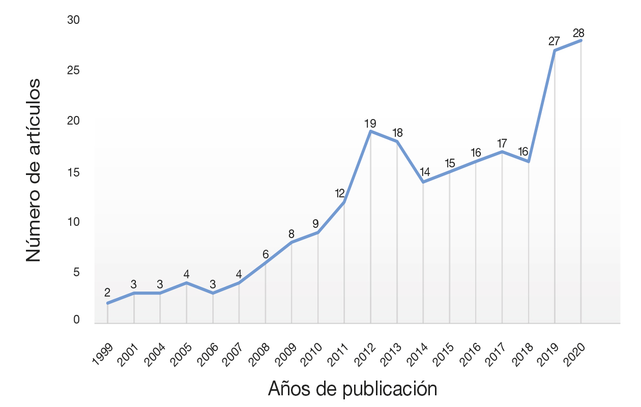 En el análisis de los resultados obtenidos en el estudio de la evolución en el número de publicaciones se pudo observar la existencia de un incremento constante y paulatino en el tiempo del número de publicaciones, destacando la presencia de dos grandes picos: año 2012 y 2020, conectados a los periodos 2000-2014 y 2015-2020, respectivamente. También resulta interesante destacar como en el año 2012 se rompe por primera vez la tendencia al alza iniciada en el 1999, y al cabo de dos años vuelve a iniciarse un ascenso en el número de artículos publicados.
