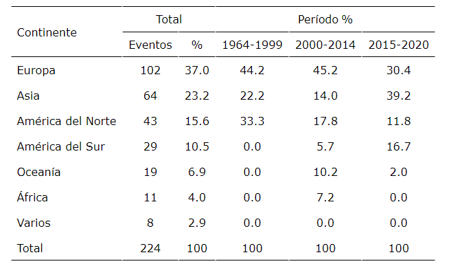 De los 224 artículos analizados se observó un claro predominio de eventos con sede en el continente europeo (37 %), seguido por el continente asiático (23.2 %) (Figura 3). Si se analizan por periodos y continentes, se observa cómo el continente europeo obtuvo mayor concentración de eventos en el periodo 1964-1999 (44.2 %) y en 2000-2014 (45.2 %), siendo la presencia del continente asiático mayor en 2015-2020 (39.2 %) (Tabla 2).