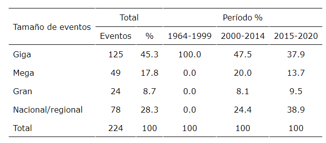 Siguiendo la clasificación realizada por Müller (2015), se observó un claro predominio de los gigaeventos (45.3 %), seguidos por los de carácter nacional/regional (recoge aquellos eventos no contemplados en la categoría de Muller), con un 28.3 %, y de los megaeventos (17.8 %). Resultados estos que analizados desde el punto de vista de distribución por periodos mantienen esta tendencia con matices: mayor porcentaje de gigaeventos en la totalidad de periodos, aunque una mayor proporción de nacional/regional en el periodo 2015-2020 (Tabla 3).