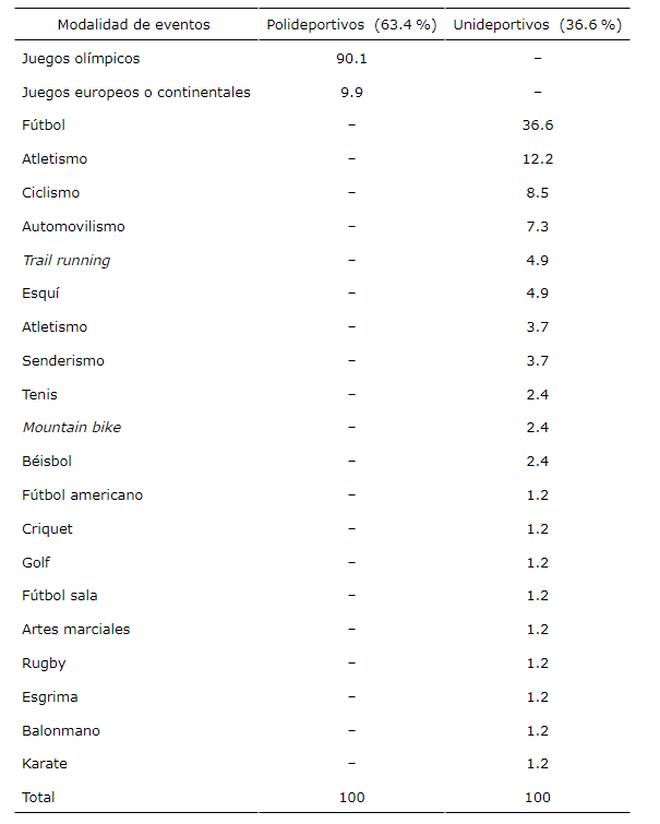 Se observó la presencia de un claro predominio de la modalidad polideportiva (63.4 %), representada por los JJ. OO. en un 90 %. De los eventos unideportivos (36.6 %), destaca la modalidad del fútbol (36.6 %), el atletismo (12.2 %), el ciclismo (8.5 %) y el automovilismo (7.3 %), las cuales implican el 64.6 % de todas las modalidades unideportivas (Tabla 4).