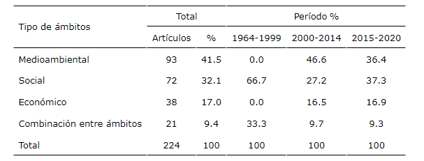 La temática de estudio más recurrente correspondió a sostenibilidad medioambiental (41.5 %), seguido de la sostenibilidad social (32.1 %). Destaca, al respecto, la reducida presencia de artículos centrados en la sostenibilidad económica. Si se realiza el análisis según la distribución por periodos temporales, el ámbito medioambiental presenta una mayor concentración en el período 2000-2014 (46.6 %), mientras que en el período 2015-2020 sería el ámbito social (37.3 %) (Tabla 5).