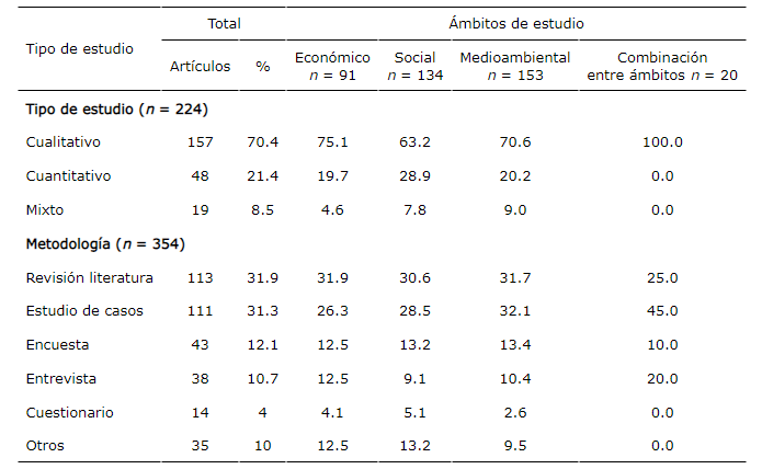Respecto a la metodología de estudio, los resultados obtenidos mostraron la presencia de un claro predominio de los estudios de tipo cualitativos en los tres ámbitos de la sostenibilidad: económico (75.1 %), social (63.2 %) y medioambiental (70.6 %), siendo la revisión de literatura la metodología más recurrente en el estudio del ámbito económico (31.9 %) y del ámbito social (30.6 %), seguida por el estudio de casos en el ámbito medioambiental (32.1 %) (Tabla 6).
