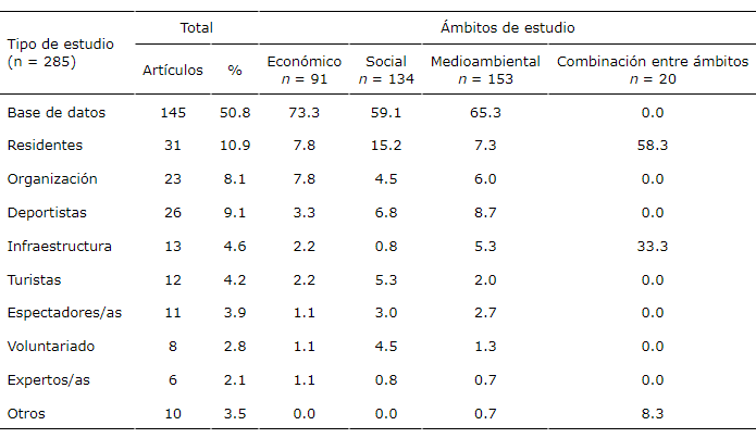 Se observó el predominio de la utilización de bases de datos en todos los ámbitos: económico (73.3 %), social (59.1 %) y medioambiental (65.3 %). Destacan, también, los residentes en el ámbito social (15.2 %) y los participantes del evento en el ámbito ambiental (8.7 %) como objetos de estudios con mayor incidencia por detrás de la base de datos (Tabla 7).