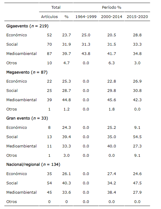 En relación con megaeventos, el ámbito más estudiado fue el medioambiental (45.6 %) en el período 2000-2014 y 2015-2020 (42.3 %), situación contraria a grandes eventos, en que el ámbito más recurrente de estudio es el social, especialmente en los últimos años (54.5 %). Destaca también la categoría nacional/regional, en la que en los años 2000-2014 el predominio de estudio era el ámbito medioambiental (38.4 %), el cual, en el último período, cambia al ámbito social (47.5 %).