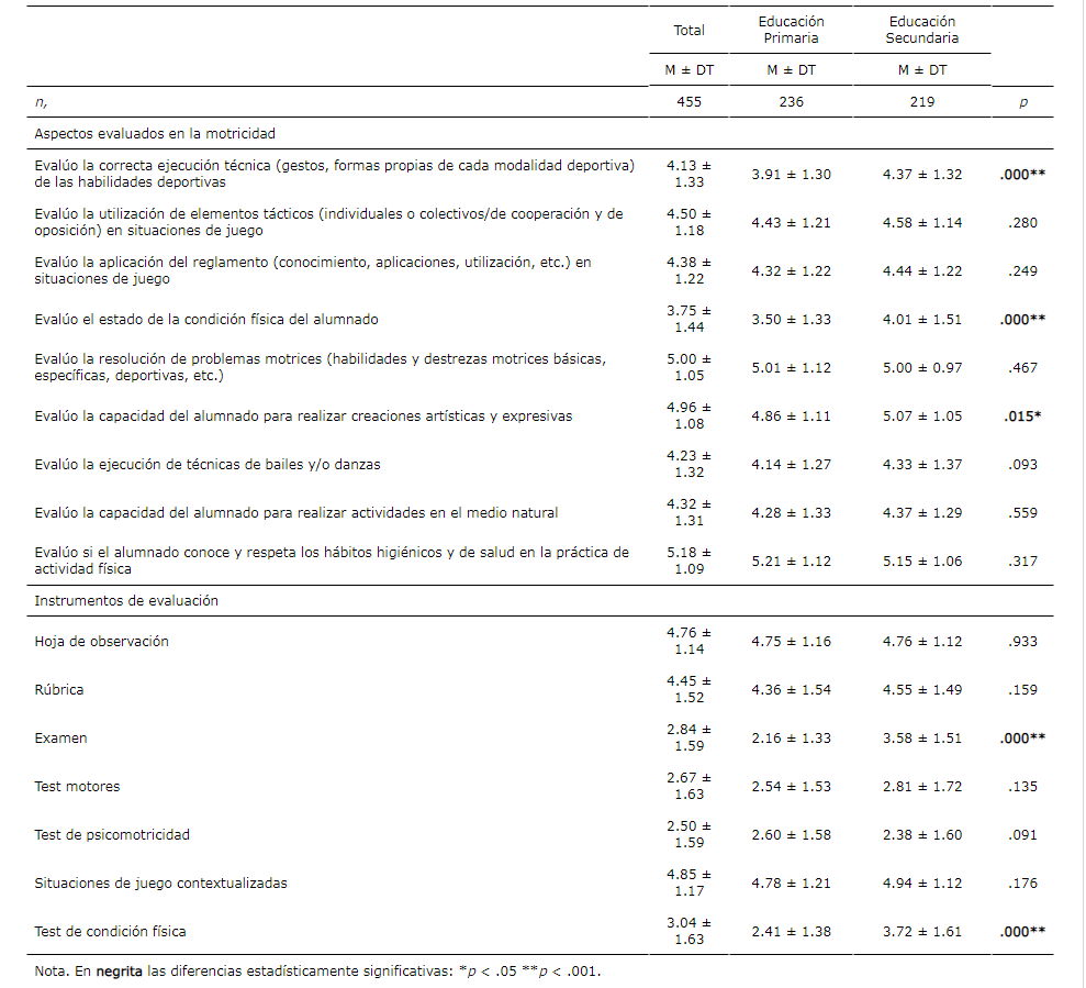 Esta investigación buscaba: (i) analizar las variables más y menos valoradas en relación con los aspectos a evaluar en la motricidad del alumnado y el tipo de instrumentos de evaluación empleados por los docentes de EF; (ii) valorar si existen diferencias estadísticamente significativas en estos aspectos entre los docentes de Educación Primaria y Educación Secundaria, en función de la experiencia docente, en función del mayor grado académico obtenido y de la titularidad del centro escolar donde desempeñan su labor docente; y (iii) valorar la relación entre los instrumentos de evaluación empleados y los aspectos que se evalúan en relación con la motricidad del alumnado. Respecto al primer objetivo, los resultados de esta investigación muestran que los elementos con valores medios más altos en los aspectos a evaluar en la motricidad del alumnado son “evaluar si el alumnado conoce y respeta los hábitos higiénicos y de salud en la práctica de actividad física y la resolución de problemas motrices” y el menos valorado “evaluar el estado de la condición física del alumnado”. Esto muestra un cambio de perspectiva con respecto a lo que tradicionalmente se ha considerado lo más importante a valorar en el área. Esto coincide con el estudio de Cañadas y Santos-Pastor (2021) y el de Chaverra-Fernández y Hernández-Álvarez (2019a), donde se evidencia que los docentes van dando cada vez menos importancia a la medición de la condición física. En relación con el uso de los instrumentos de evaluación, los reportados como los más empleados son las situaciones de juego contextualizadas y las hojas de observación y los menos empleados, los test de psicomotricidad, quedando de lado los tradicionales test de condición física, y dando paso a nuevos instrumentos de evaluación para valorar las competencias y aprendizajes motores del alumnado, al igual que han evidenciado estudios previos (Chaverra y Hernández-Álvarez, 2019b).