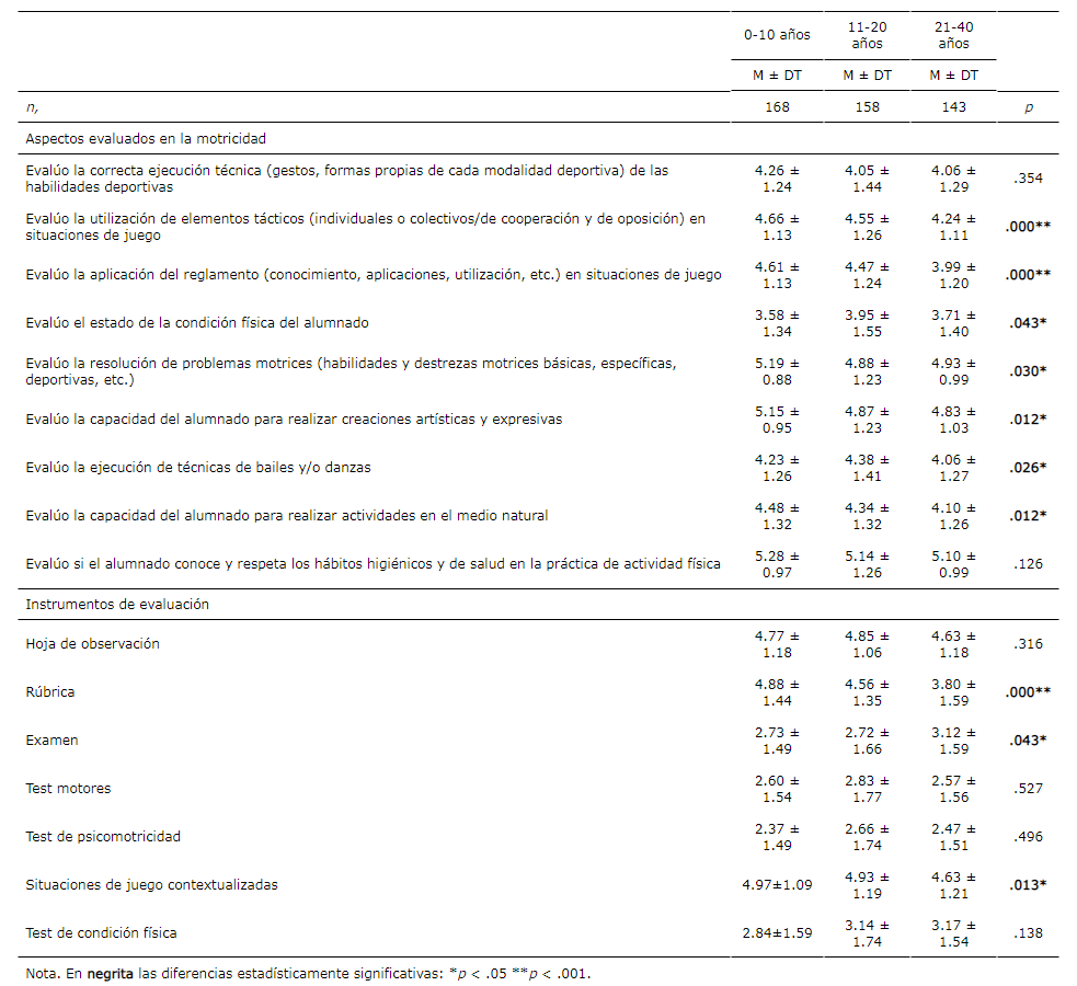 Las diferencias en función de la experiencia docente en los aspectos evaluados en la motricidad del alumnado se presentan en la Tabla 4. De los 9 ítems estudiados, 7 presentan diferencias estadísticamente significativas entre los grupos, siendo el grupo de menor experiencia docente el que presenta valores medios más elevados. Estos son: (i) evalúo la utilización de elementos tácticos en situaciones de juego (. < .001; 4.66 ± 1.13 vs. 4.55 ± 1.26 vs. 4.24 ± 1.11); (ii) evalúo la aplicación del reglamento en situaciones de juego (. < .001; 4.61 ± 1.13 vs. 4.47 ± 1.24; 3.99 ± 1.20); (iii) evalúo la resolución de problemas motrices (. = .030; 5.19 ± 0.88 vs. 4.88 ± 1.23 vs. 4.93 ± 0.99); (iv) evalúo la capacidad del alumnado para realizar creaciones artísticas y expresivas (. = .012; 5.15 ± 0.95 vs. 4.87 ± 1.23 vs. 4.83 ± 1.03); y (v) evalúo la capacidad del alumnado para realizar actividades en el medio natural (. = .012; 4.48 ± 1.32 vs. 4.34 ± 1.32 vs. 4.10 ± 1.26). En el caso de los ítems evalúo el estado de la condición física del alumnado (. = .043; 3.58 ± 1.34 vs. 3.95 ± 1.55 vs. 3.71 ± 1.40) y evalúo la ejecución técnica de bailes y/o danzas (. = .026; 4.23 ± 1.26 vs. 4.38 ± 1.41 vs. 4.06 ± 1.27), son los docentes que tienen entre 11-20 años de experiencia los que muestran valores medios más altos. En la Tabla 4 se recoge también la diferencia de los instrumentos empleados por los docentes de EF en función de la experiencia docente. Se encuentran diferencias estadísticamente significativas en 3 de los 7 ítems estudiados: (i) las rúbricas (. < .001; 4.88 ± 1.44 vs. 4.56 ± 1.35 vs. 3.80 ± 1.59) y (ii) situaciones de juego contextualizadas (. = .013; 4.97 ± 1.09 vs. 4.93 ± 1.19 vs. 4.63 ± 1.21) son los docentes con menor experiencia docente los que afirman usarlas con mayor frecuencia, siendo los docentes con mayor experiencia los que menos las emplean. Por otro lado, aparecen diferencias estadísticamente significativas en el empleo de exámenes (. = .043; 2.73 ± 1.49 vs. 2.72 ± 1.66 vs. 3.12 ± 1.59), siendo los docentes con mayor experiencia los que afirman usarlos más a menudo.
