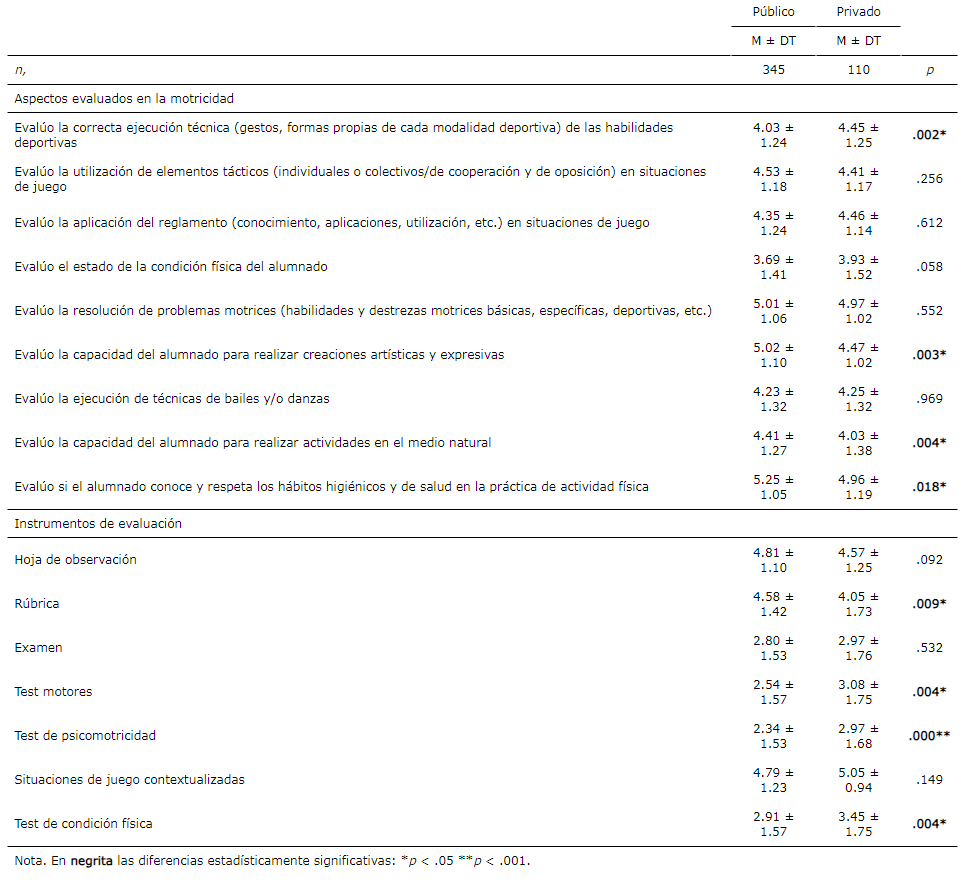 En la Tabla 5 se presentan las diferencias en función de la titularidad del centro en los aspectos evaluados en la motricidad del alumnado y en el uso de los instrumentos de evaluación. En cuanto a los aspectos evaluados en la motricidad del alumnado, únicamente 4 de los 9 ítems estudiados muestran diferencias estadísticamente significativas en función de la titularidad del centro. En 3 de ellos, es el profesorado que imparte docencia en centros públicos el que muestra valores medios más altos. Concretamente en: (i) evalúo la capacidad del alumnado para realizar creaciones artísticas y expresivas (. = .003; 5.02 ± 1.10 vs. 4.47 ± 1.02); (ii) evalúo la capacidad del alumnado para realizar actividades en el medio natural (. = .004; 4.41 ± 1.27 vs. 4.03 ± 1.38); y (iii) evalúo si el alumnado conoce y respeta los hábitos higiénicos y de salud en la práctica de actividad física (. = .018; 5.25 ± 1.05 vs. 4.96 ± 1.19). Por último, en el ítem evalúo la correcta ejecución técnica de las habilidades deportivas es el profesorado de los centros privados el que da mayor importancia a este aspecto a la hora de evaluar la motricidad del alumnado, obteniendo valores medios más altos (. = .002; 4.03 ± 1.24 vs. 4.45 ± 1.25). Respecto a las diferencias en la frecuencia de uso de los instrumentos por los docentes que ejercen su labor docente en centros públicos y privados, se encuentran diferencias estadísticamente significativas en 4 de los 7 ítems analizados. En tres de ellos el profesorado que ejerce en centros privados muestra valores medios más altos: (i) test motores (. = .004; 2.54 ± 1.57 vs. 3.08 ± 1.75), test de psicomotricidad (. < .001; 2.34 ± 1.53 vs. 2.97 ± 1.68) y test de condición física (. = .004; 2.91 ± 1.57 vs. 3.45 ± 1.75), siendo en todos los casos el profesorado de los centros de carácter privado el que afirma emplearlos con mayor frecuencia. También aparecen diferencias estadísticamente significativas en el empleo de rúbricas (. = .009; 4.58 ± 1.42 vs. 4.05 ± 1.73) reportando usarlas en mayor medida los docentes que trabajan en centros públicos.