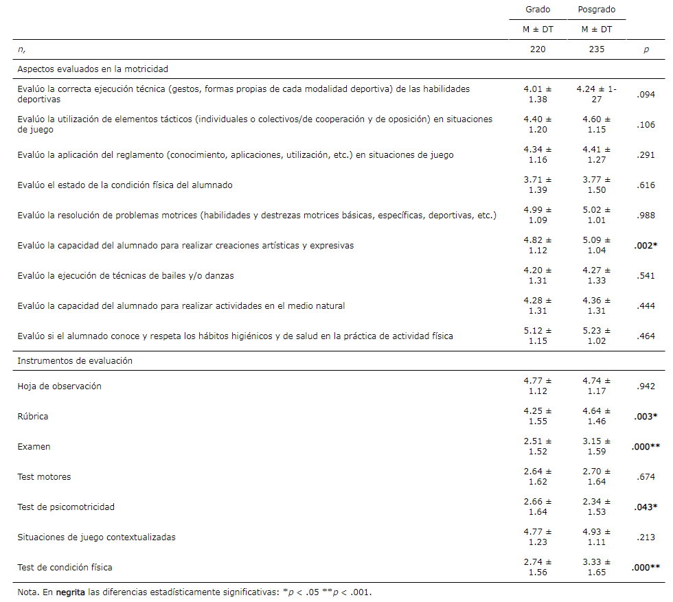 En la Tabla 6 se presentan las diferencias en función del mayor grado académico obtenido. Respecto a los aspectos evaluados en la motricidad del alumnado, solo el ítem evalúo la capacidad del alumnado para realizar creaciones artísticas y expresivas presenta diferencias estadísticamente significativas entre el profesorado con formación de grado y posgrado, siendo estos últimos los que muestran valores medios más altos (. = .002; 4.82 ± 1.12 vs. 5.09 ± 1.04). En relación con en el empleo de instrumentos de evaluación en función del mayor grado académico de los docentes, aparecen diferencias estadísticamente significativas en 4 de los 7 ítems analizados. Aquellos docentes con estudios de posgrado muestran valores medios más altos en el uso de: (i) las rúbricas (. = .003; 4.25 ± 1.55 vs. 4.64 ± 1.46); (ii) los exámenes (. <.001; 2.51 ± 1.52 vs. 3.15 ± 1.59); y (iii) los test de condición física (. < .001; 2.74 ± 1.56 vs. 3.33 ± 1.65). En el caso de los test de motricidad son los docentes con estudios de grado los que muestran valores medios más altos (. = .043; 2.66 ± 1.64 vs. 2.34 ± 1.53).