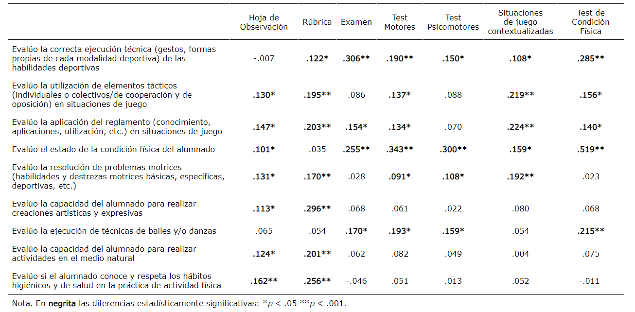 En la Tabla 7 se recoge la relación entre los instrumentos de evaluación empleados y los aspectos que se evalúan en relación con la motricidad del alumnado. Aunque entre los ítems investigados aparecen bastantes relaciones, estas son débiles (. < .200). Destacamos aquí aquellas con valores más altos entre los ítems estudiados. En el caso de la rúbrica, destaca la relación con evaluar la capacidad del alumnado para realizar creaciones artísticas y expresivas (. = .296; . < .001). El examen se relaciona positivamente con evaluar la correcta ejecución técnica de las habilidades deportivas (. = .306; . < .001) y los test motores y psicomotores con la valoración del estado de la condición física del alumnado (. = .343 y . = .300, respectivamente; . < .001). Las situaciones de juego contextualizadas se relacionan con evaluar la utilización de elementos tácticos en situaciones de juego (. = .219; . < .001) y evaluar la aplicación del reglamento en situaciones de juego (. = .224; . < .001). Por último, los test de condición física tienen una fuerte y positiva relación con evaluar el estado de condición física del alumnado (. = .519; . < .001).