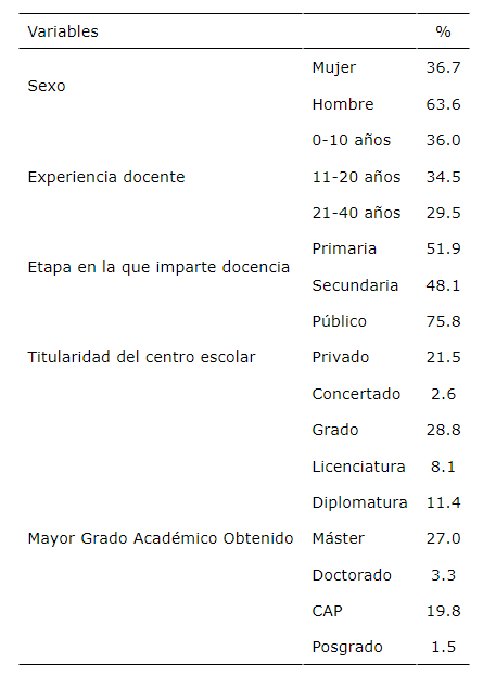 Se empleó la prueba de Kolmogorov-Smirnov para comprobar la normalidad de la muestra. Dado que esta no presentaba una distribución normal, se procedió a realizar análisis no paramétricos. Para dar respuesta al primero de los objetivos, se presentan los descriptivos de la muestra para las variables estudiadas (Tabla 2). Para el segundo de los objetivos, comprobar las diferencias entre los docentes de Educación Primaria y Educación Secundaria en función del mayor grado académico obtenido y de la titularidad del centro escolar donde desempeñan su labor docente, se empleó la U de Mann-Whitney. Para comprobar las diferencias en función de la experiencia docente, se empleó la H de Kruskal-Wallis. Para la realización de los análisis en función de la titularidad del centro, se juntaron en una misma variable los docentes que trabajan en centros privados y concertados y, para analizar en función del mayor grado académico, se agruparon aquellos con nivel de grado (grado, licenciatura, diplomatura) y nivel posgrado (máster, doctorado, CAP y otros posgrados). Por último, para comprobar la relación entre los instrumentos de evaluación empleados y los aspectos que se evalúan en relación con la motricidad del alumnado se empleó la correlación de Spearman. Los análisis se realizaron con el software estadístico SPSS v. 27. y el nivel de significatividad se estableció en . < .05.