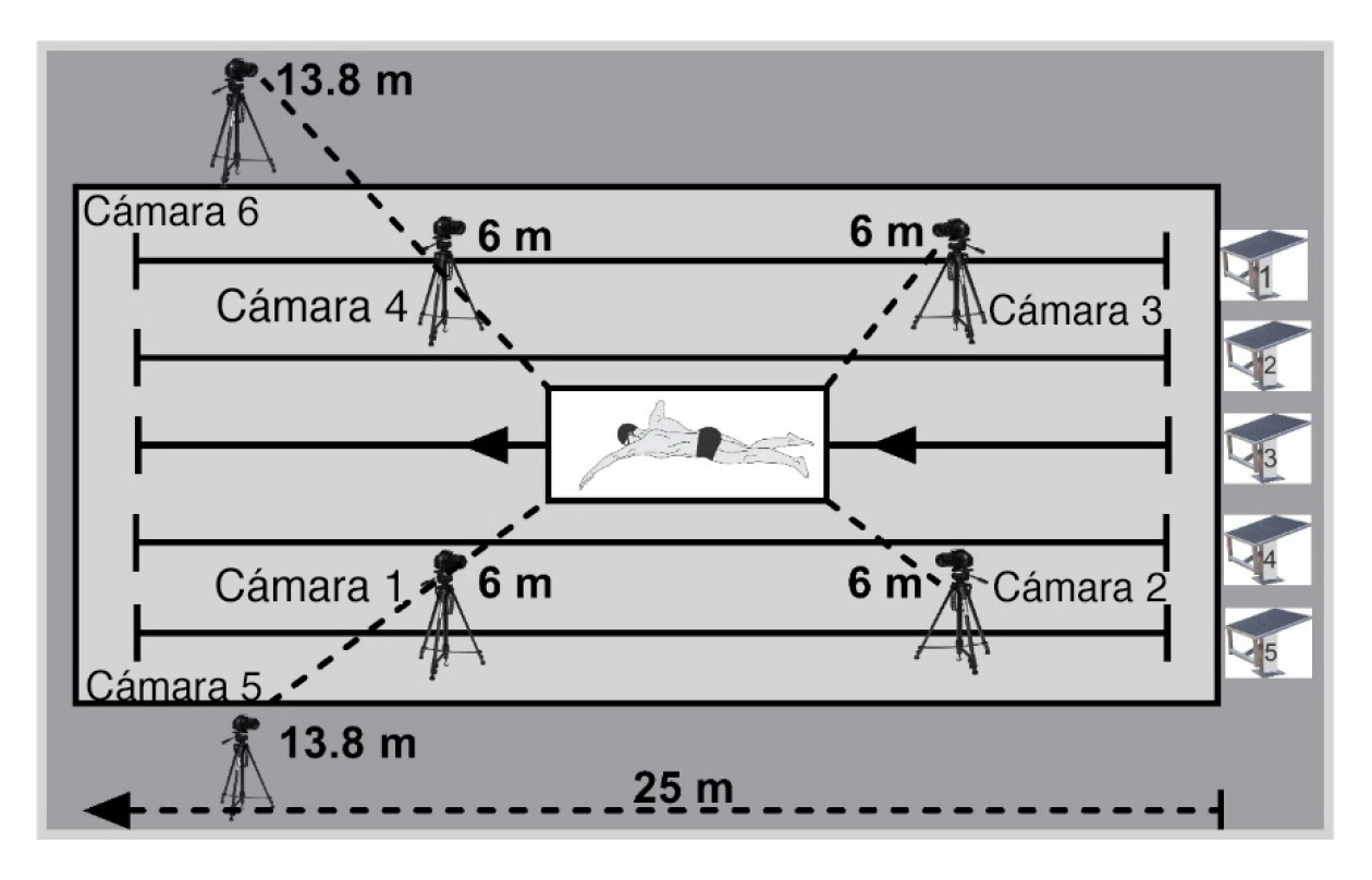 Los parámetros cinemáticos se obtuvieron mediante videogrametría tridimensional (3D) con seis cámaras fijas (funcionando a 60 Hz), cuatro de las cuales se colocaron bajo el agua (0.5 m) dentro de una caja estanca, y dos por encima del agua (a 1.52 m del suelo) (De Jesus et al., 2015). El recorrido nadado por los deportistas fue grabado por las cámaras dentro de un espacio calibrado que se ubicó en el carril 3 de la piscina, orientado longitudinalmente (eje x como dirección del nadador), a la misma distancia de ambas cabeceras de la piscina (Figura 1) con unas dimensiones de la estructura del espacio calibrado de x = 4.5 m (eje horizontal); y = 1 m (eje medial-lateral); z = 1.5 m (eje vertical). Se utilizó una señal luminosa, grabada de manera simultánea por las seis cámaras, para sincronizar las imágenes de las cámaras de vídeo en la misma base temporal como referencia en la reconstrucción de las coordenadas en el software de análisis.