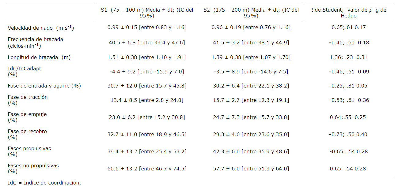 Los tamaños del efecto (efectos por tramos en la T200) fueron: (i) insignificante para la velocidad de nado, la frecuencia de brazada, el IdC/IdCAdapt, la duración de las fases de entrada y agarre, y de tracción; y (ii) pequeño para la longitud de brazada, la duración de las fases de tracción, empuje, recobro, propulsivas y no propulsivas.