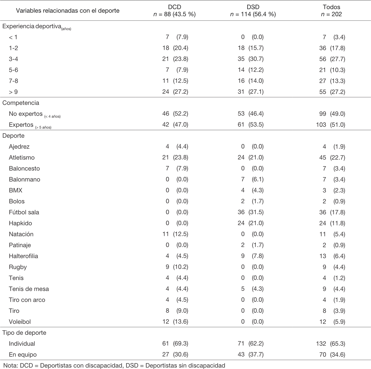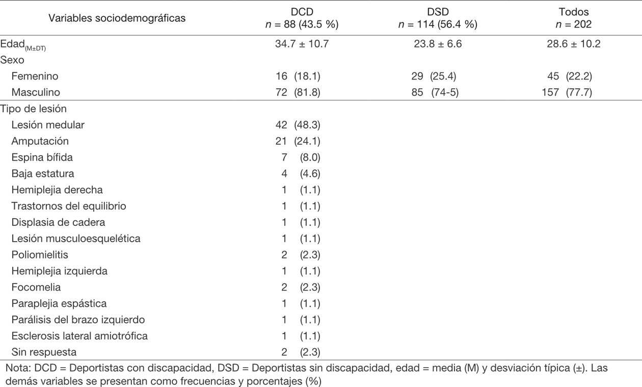 Se realizó un estudio cuantitativo no experimental. Participaron 202 deportistas: . = 88 DCD y n = 114 DSD. La selección de la muestra se realizó intencionalmente en varias ciudades de Colombia (Medellín, Armenia, Manizales y Cali). Los voluntarios son representativos de 19 disciplinas deportivas. La información sobre las variables sociodemográficas, el tipo de discapacidad y las variables deportivas se encuentra en las Tablas 1 y 2, respectivamente.